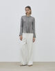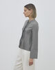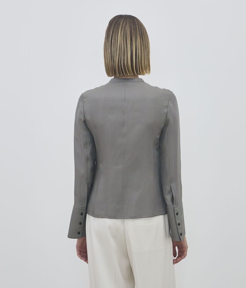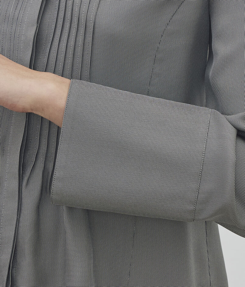 モノトーンのカラー使いでモダンで洗練されたマイクロハウンドトゥース柄をプリントしたブラウス。