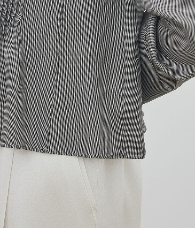 ややウエストシェイプされたピンタックブラウスは、すっきりとしていてボディラインを綺麗に見せてくれる一枚。パネル構造なのでジャケットの雰囲気できれいめに着こなせます。
