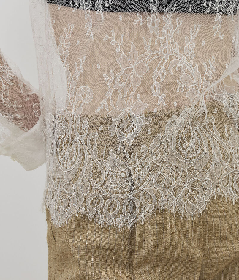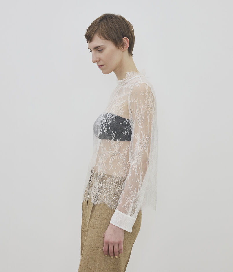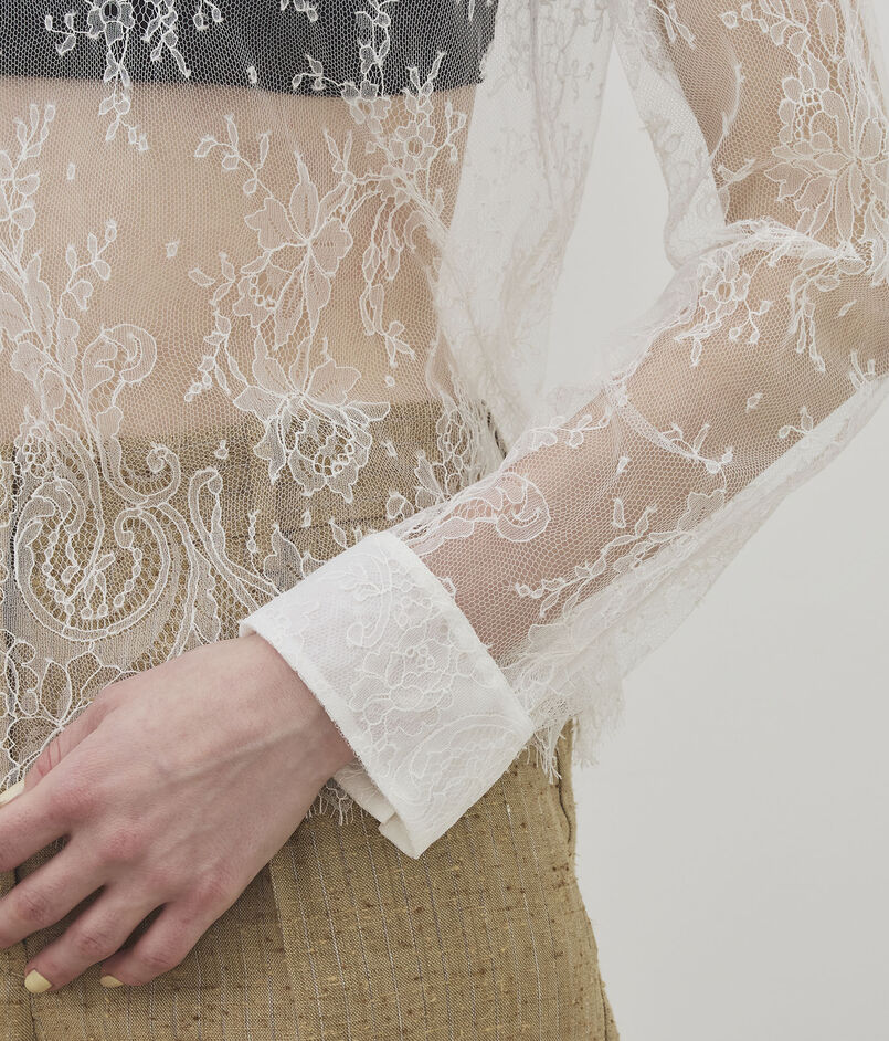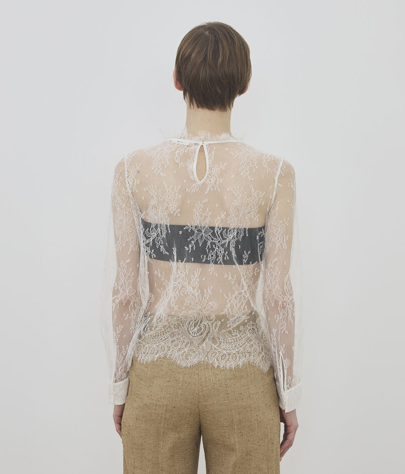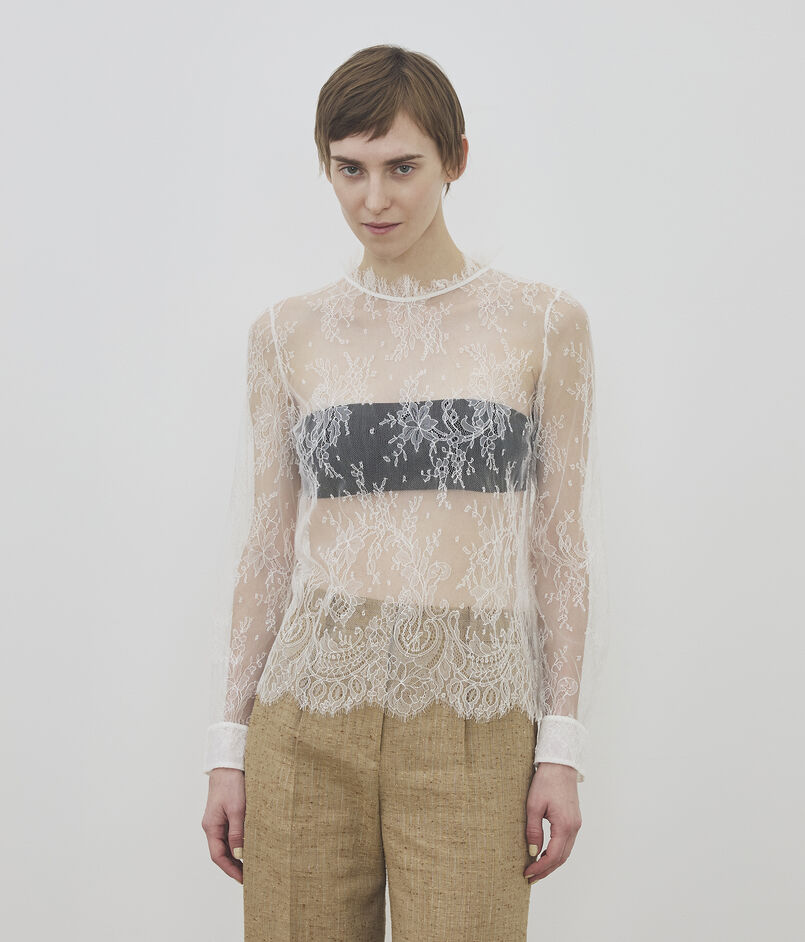 クルーネックのブラウスは、ジャケットのインナーとして衿元や袖からレースを覗かせれば今シーズンのムードを一気に盛り上げてくれるアイテム。
