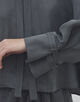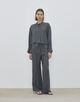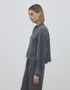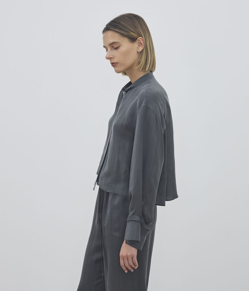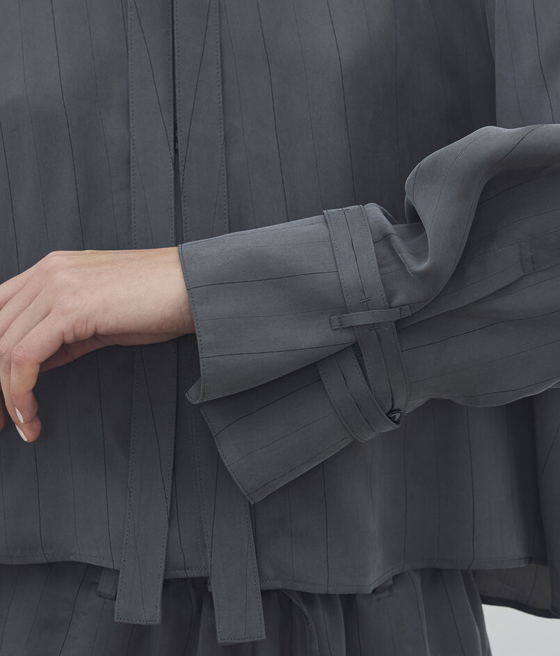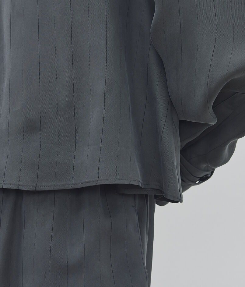 ストライプの直線が素材の持つドレープと交わることで、奥行きのある表情を生み出しています。