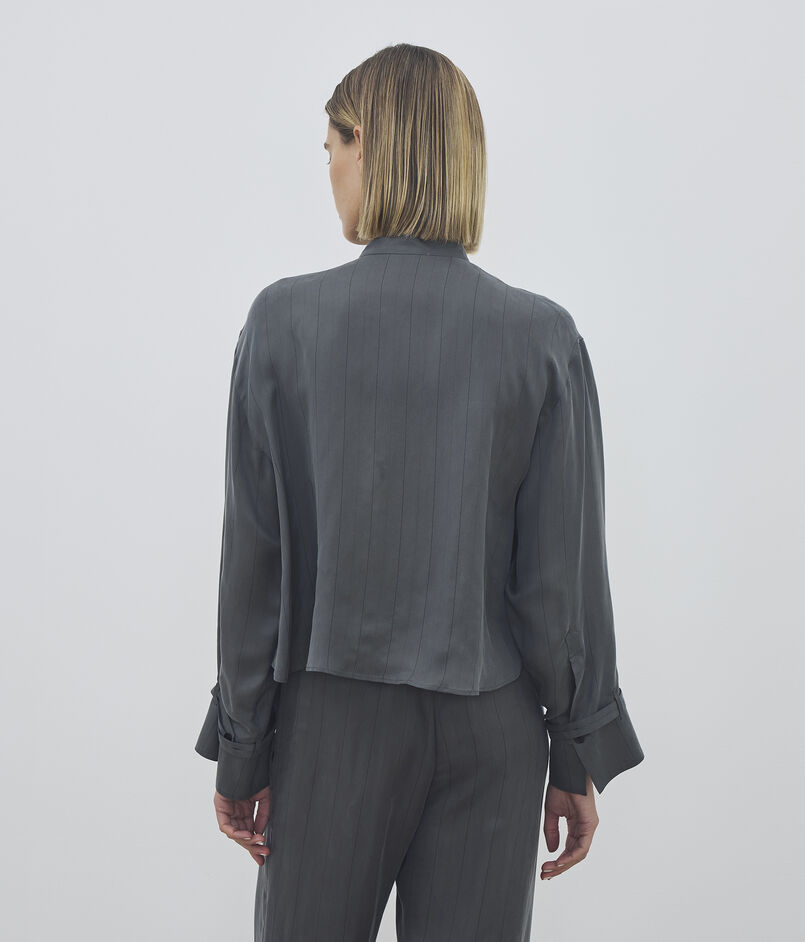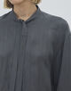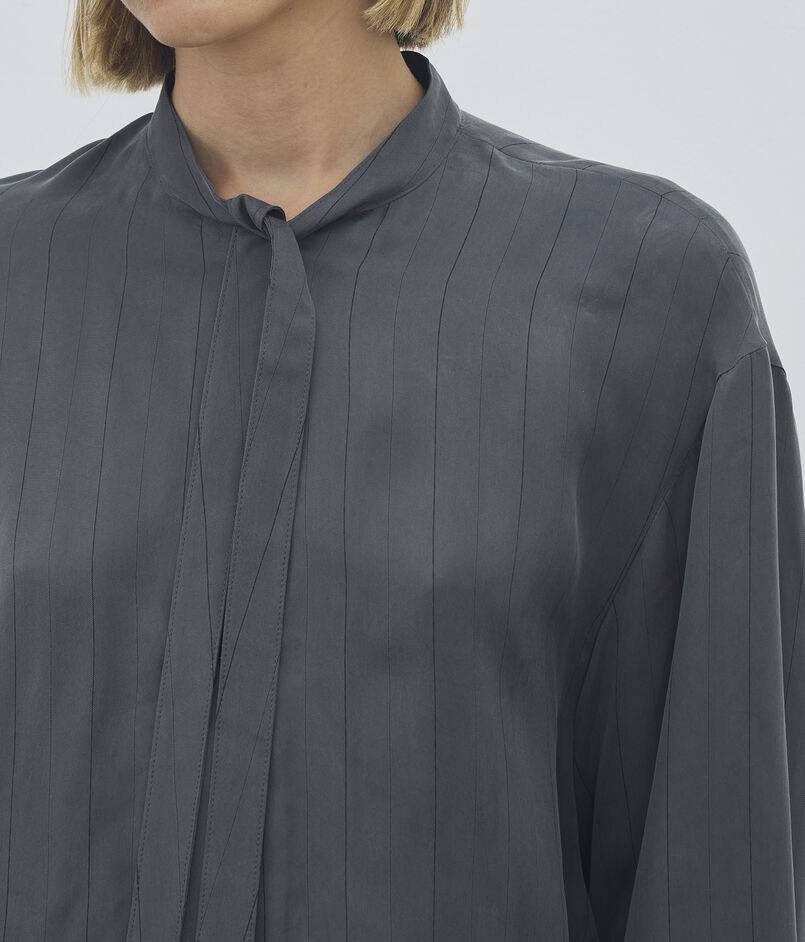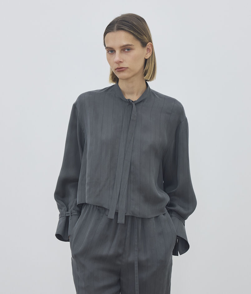 後染めで繊細に染め分けられたキュプラストライプ素材を使用したブラウス。