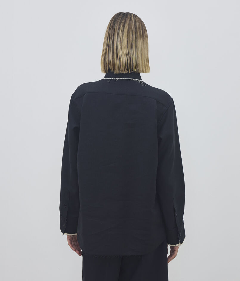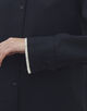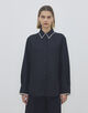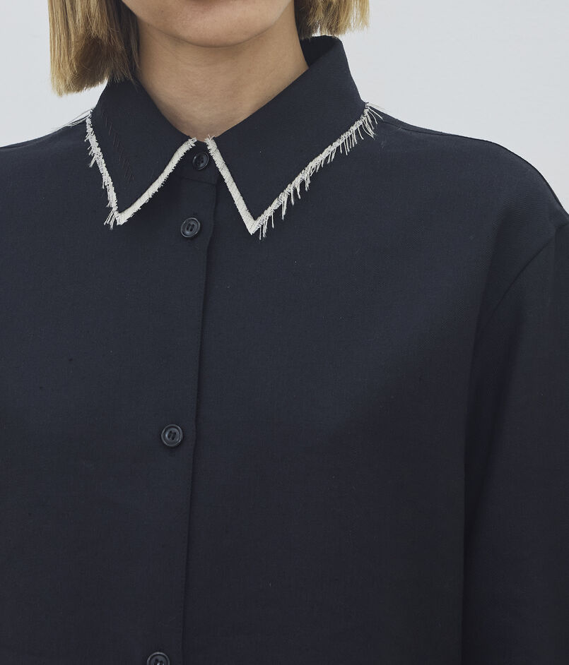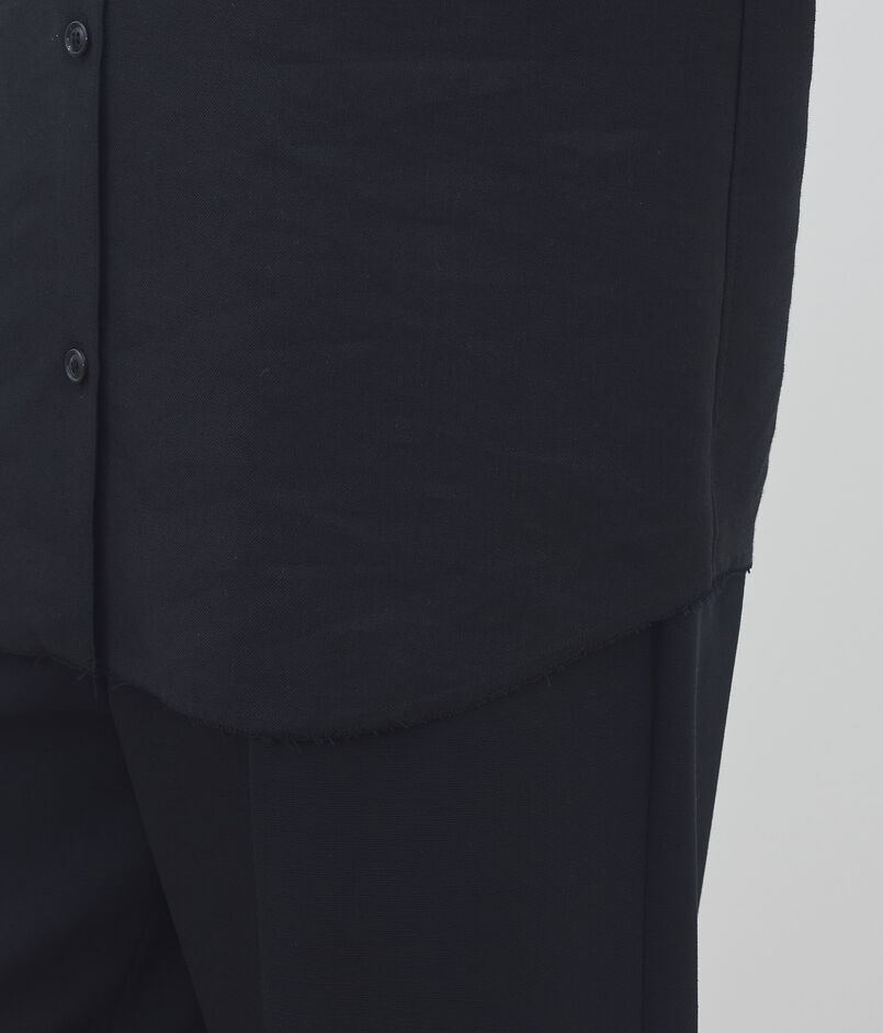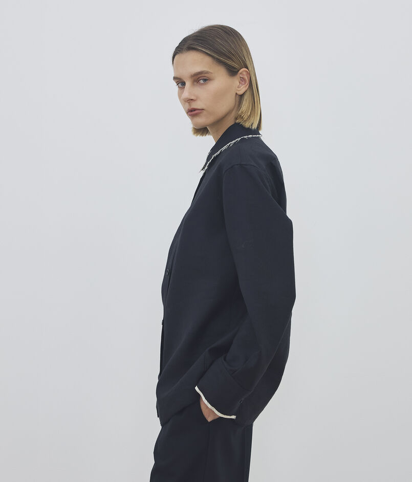 襟と袖口のカットオフのディテールでブランドらしいモードさをプラス。