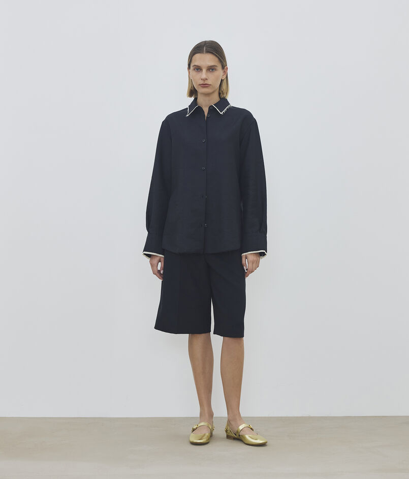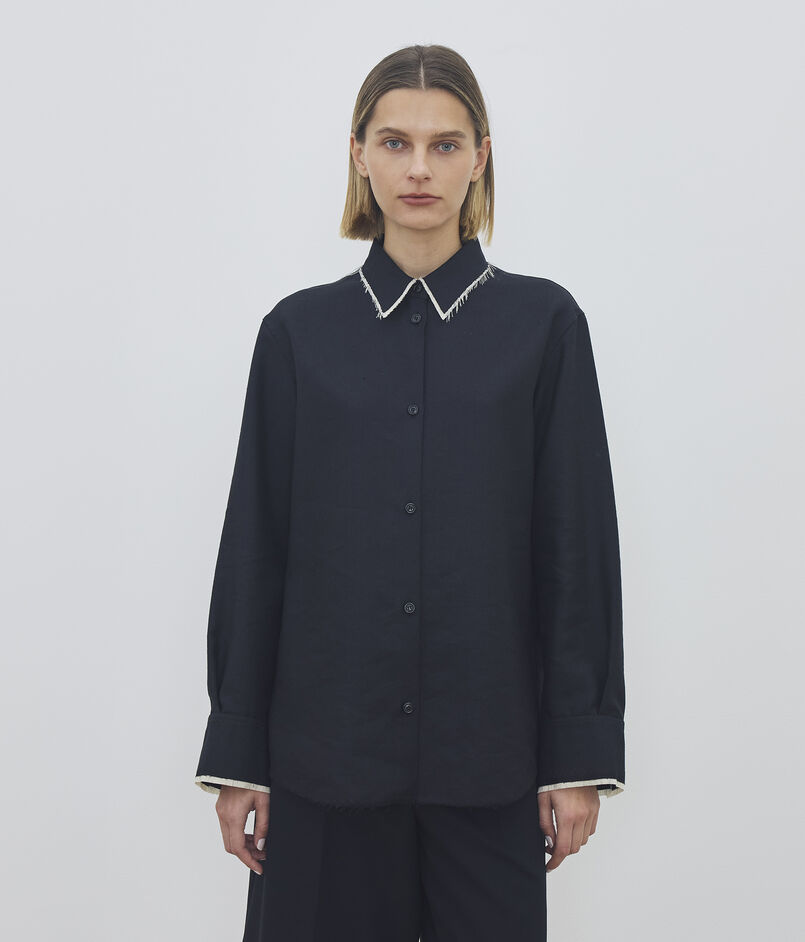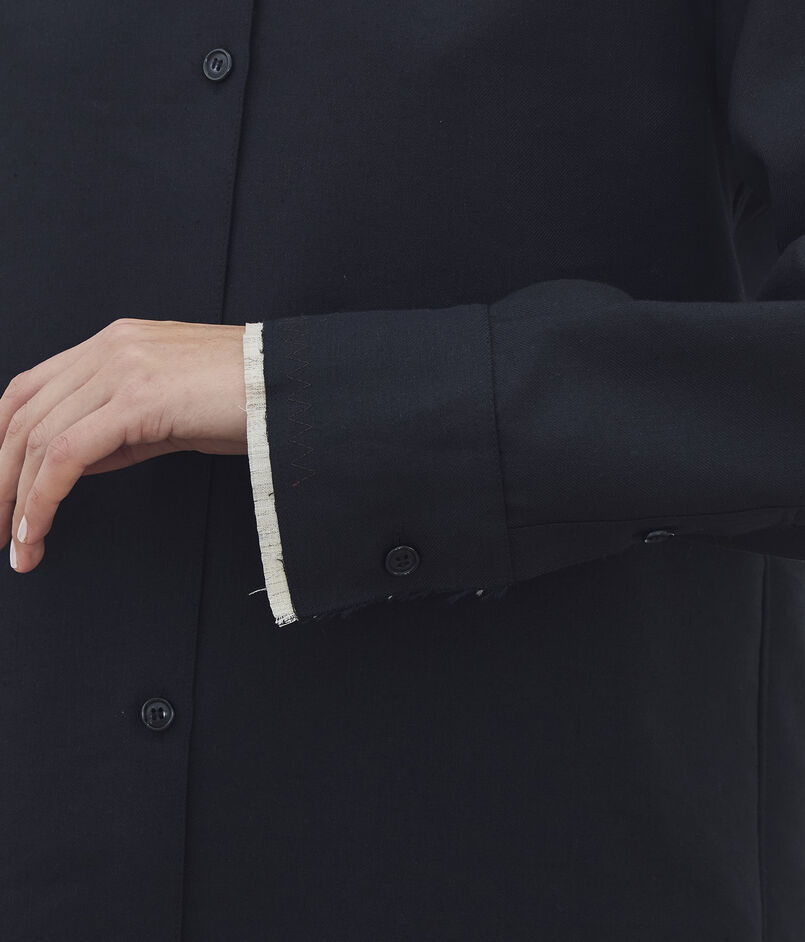 タテ糸にリネン、ヨコ糸にウールモヘヤを使用し織り上げた、ハリのある素材感が特徴のシャツ。