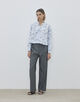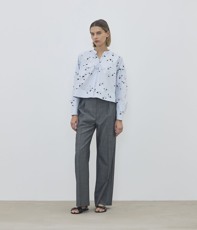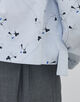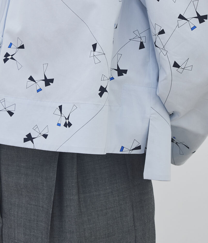 タテヨコともに極細番手の超長綿を使用し高密度に織り上げたコットンタイプライター素材に、アートからインスピレーションを得て表現した〈DES PRES〉オリジナルのトライアングル柄をプリントしたシリーズ。