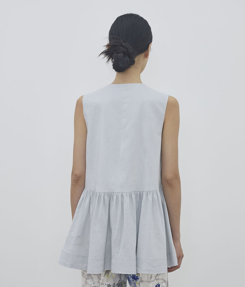 コンパクトな上半身から裾に向かってドラマティックに広がる、構築的なペプラムシルエットが魅力的なブラウス。