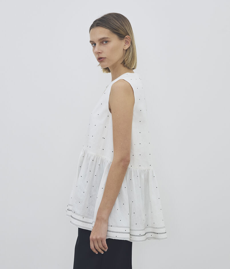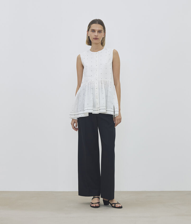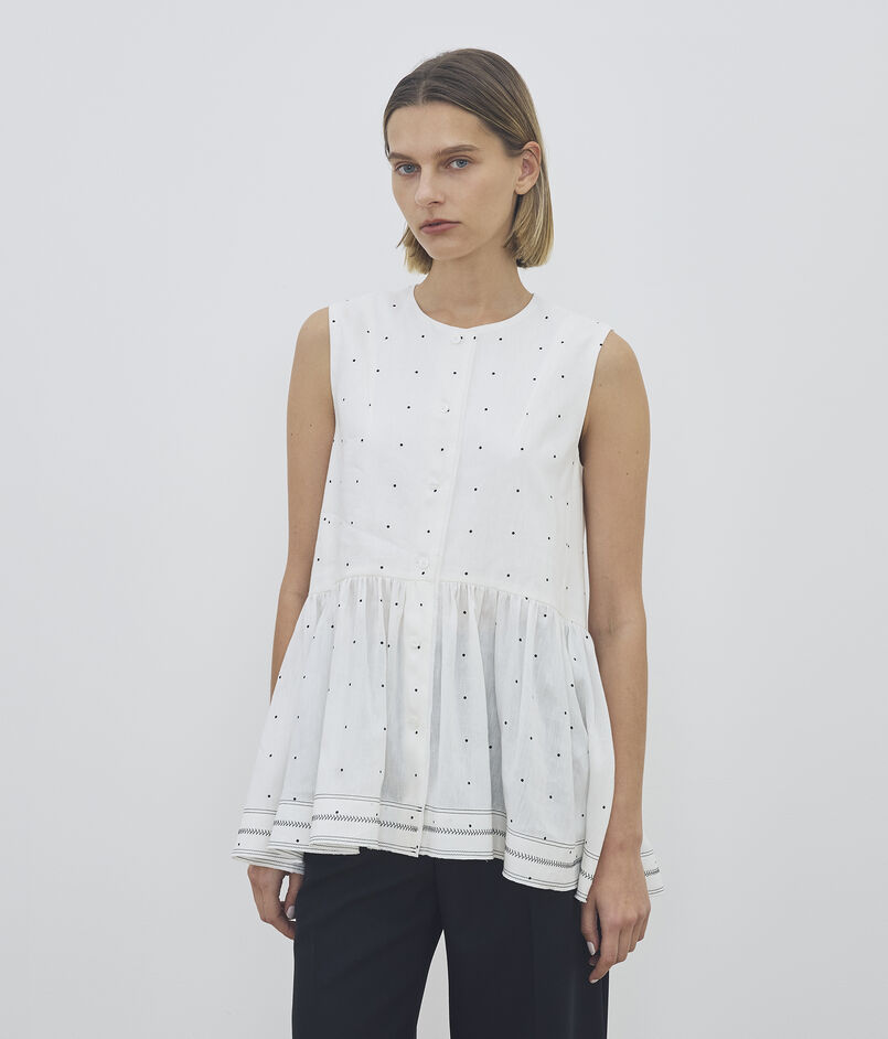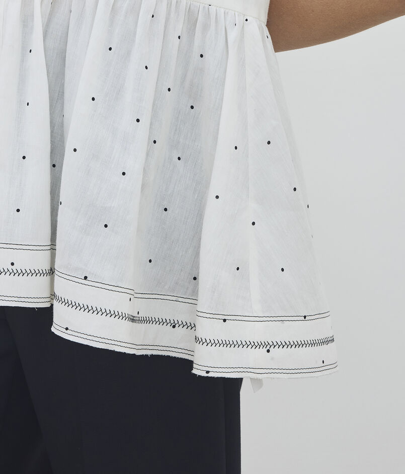 コンパクトな上半身から裾に向かってドラマティックに広がる、構築的なペプラムシルエットが魅力的なブラウス。
