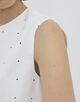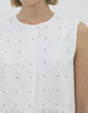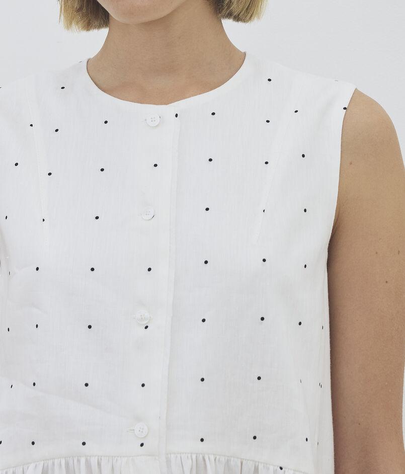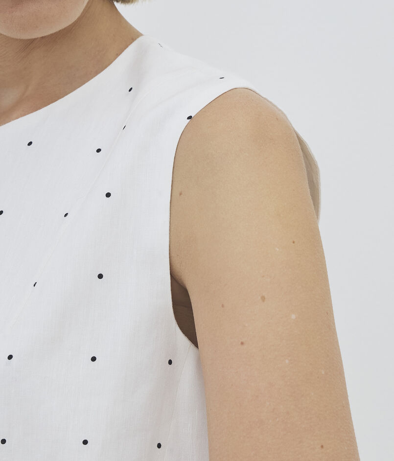 リネンとラミーの清涼感に、シルクの繊細な光沢を絶妙なバランスで混紡したリュクスな素材に、ドットプリントを施したブラウスシリーズ。