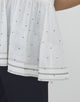 裾の断ち切りディテールや刺繍でフラットな素材に凹凸をつけています。
