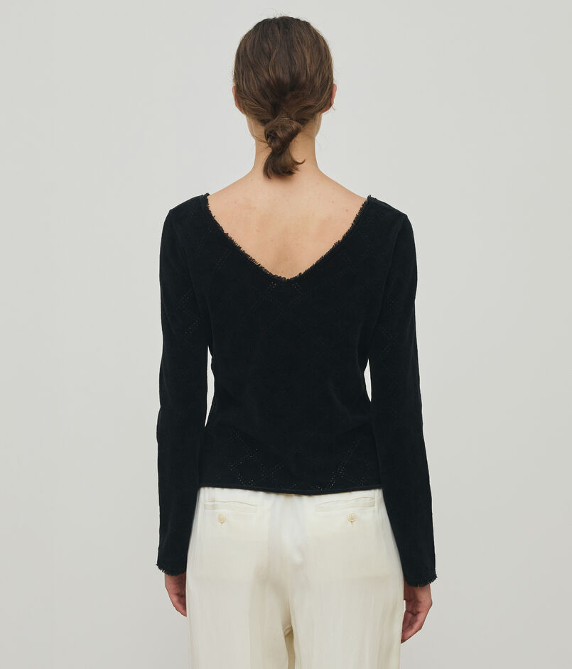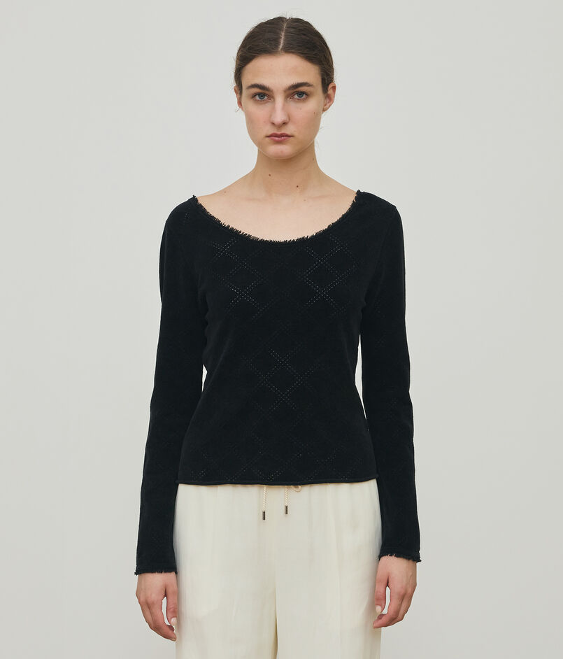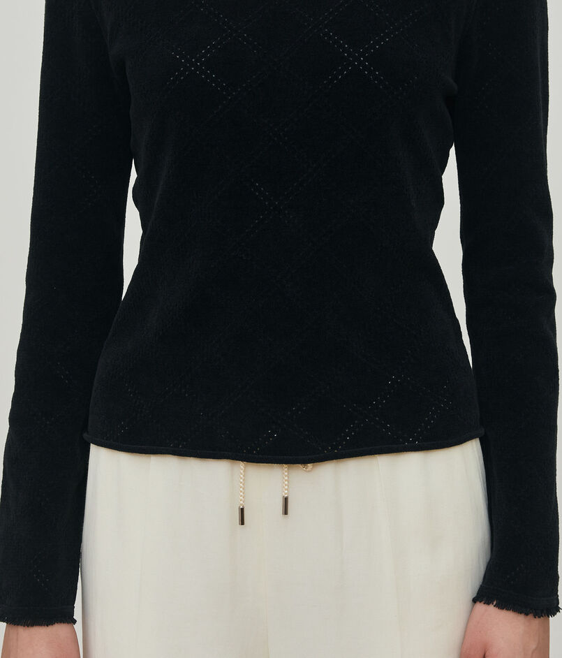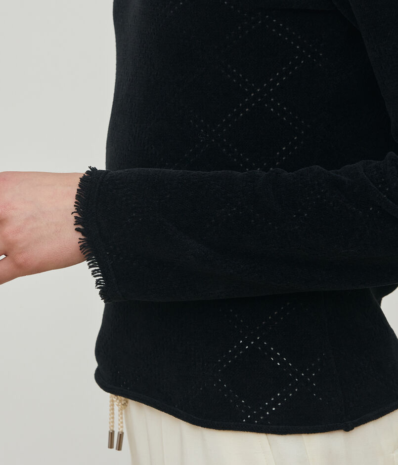 身生地にはアイレットでチェック柄を表現し、襟端や袖口には共糸のフリンジをあしらうことでグランジテイストを感じる仕上がりに。