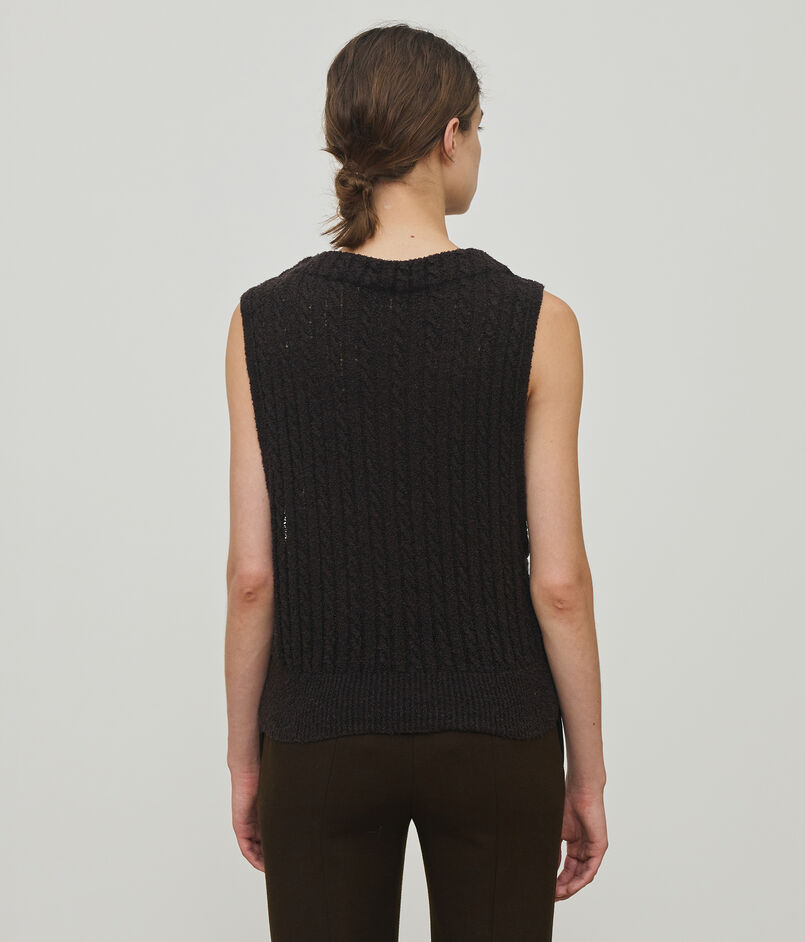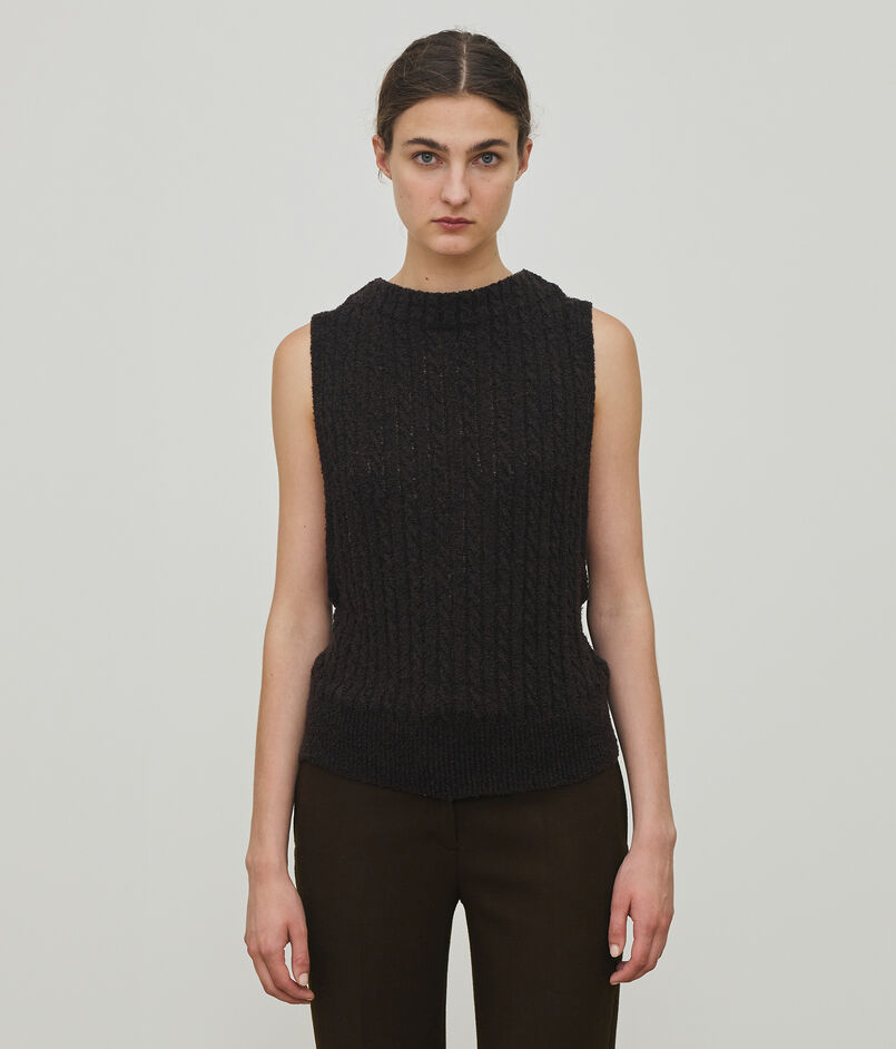 ケーブルベストはゆとりのあるサイズ感なので、シャツやカットソーとのレイヤードも楽しめ、早い時期から着用可能なアイテム。