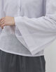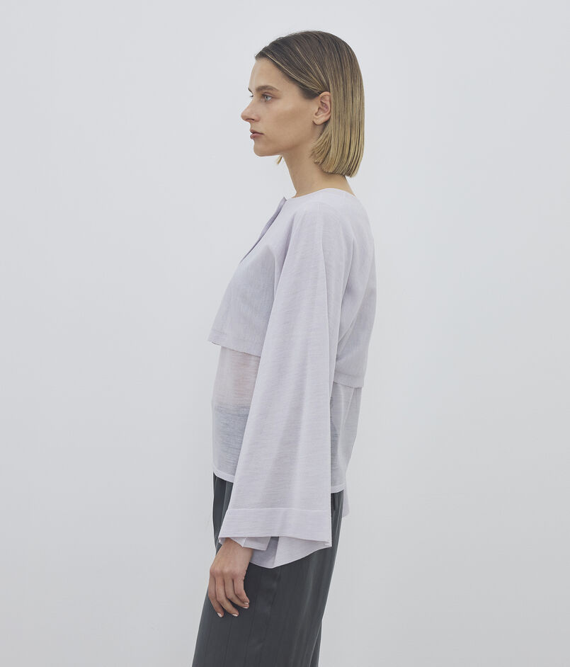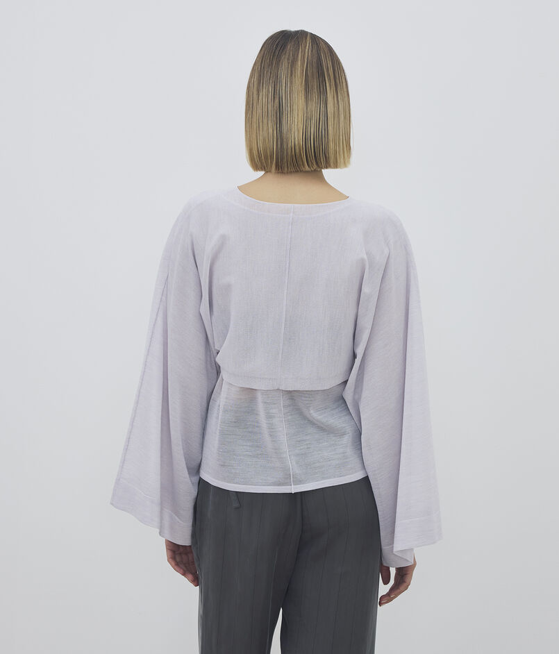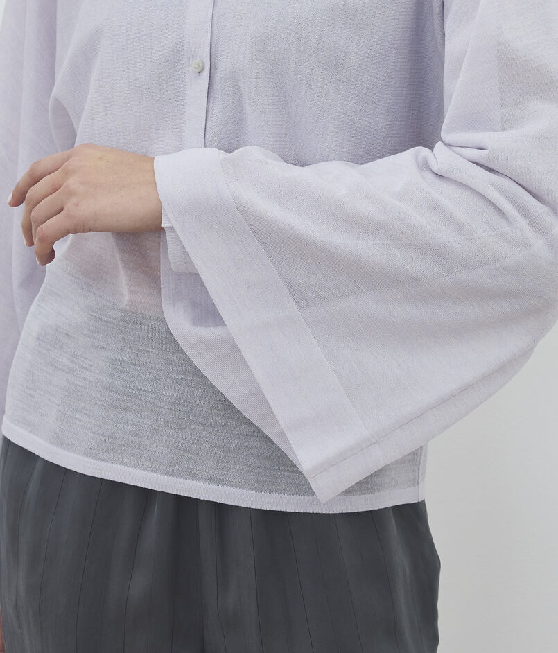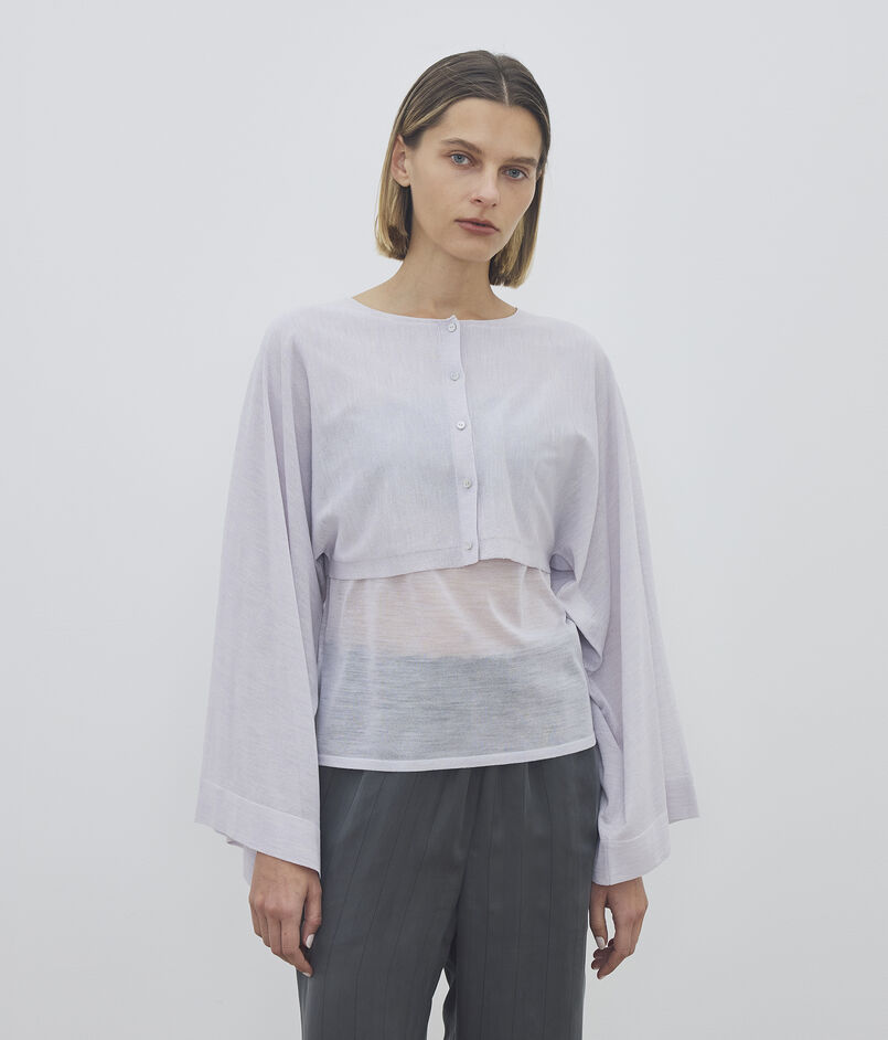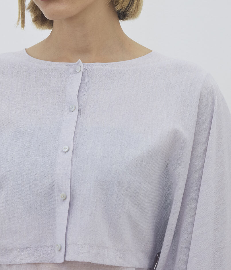 クロップド丈と大胆なワイドスリーブのコントラストが目を惹くカーディガン。