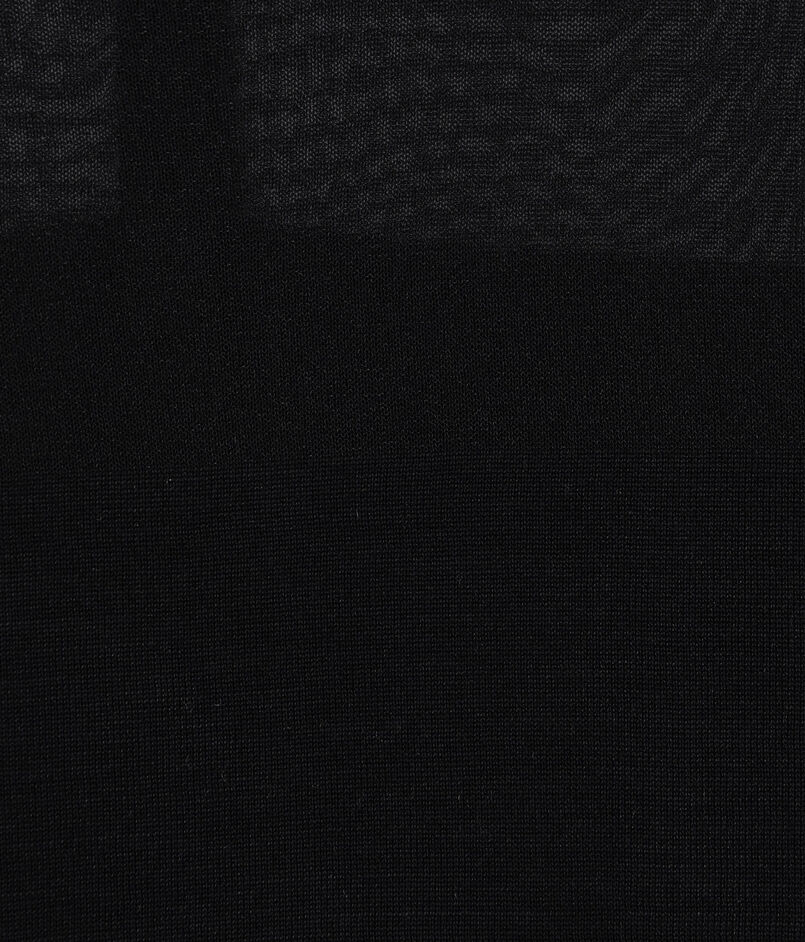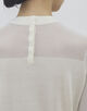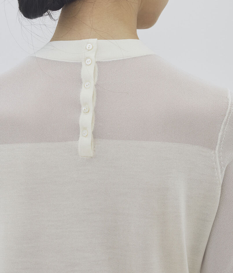 デコルテとスリーブ部分は細番手のレーヨンナイロン糸を使用して繊細なシアー感をプラスしています。