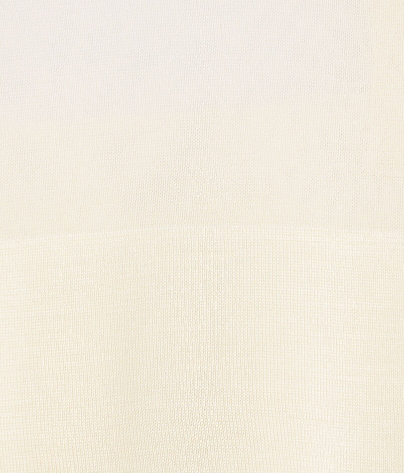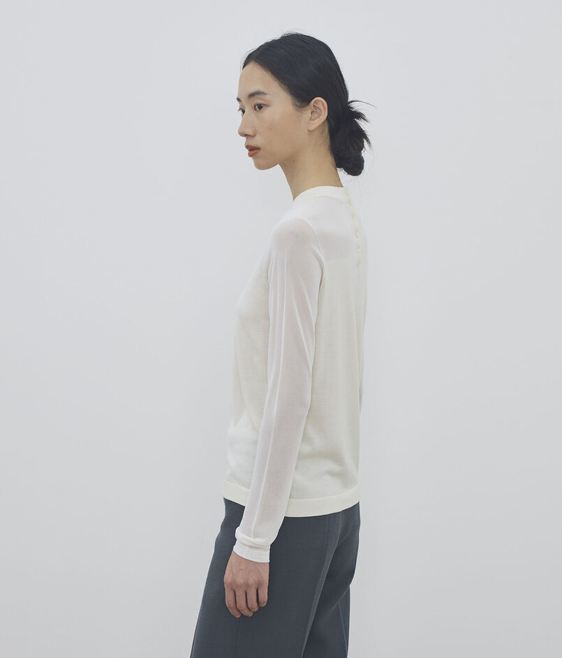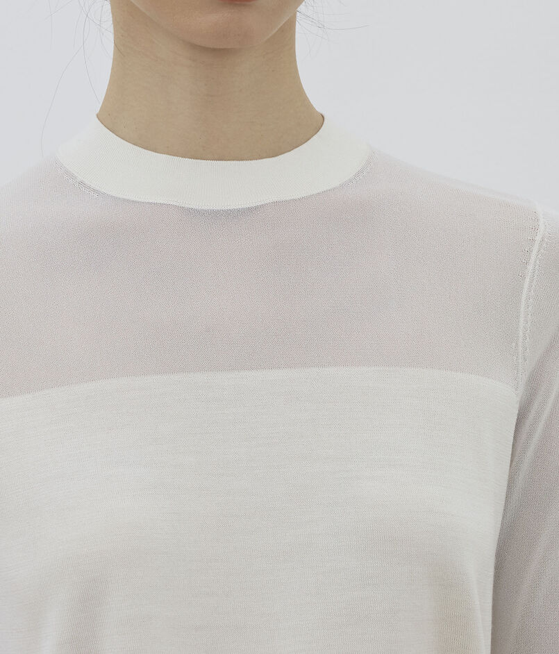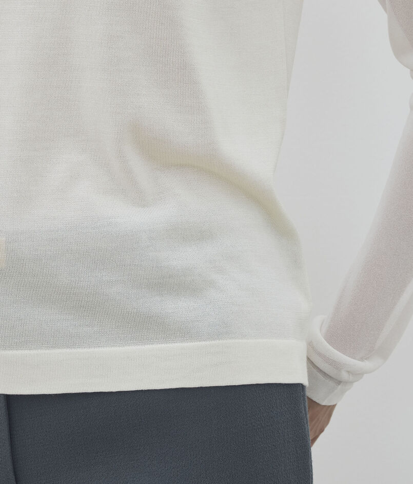 ハイツイストシルクの総針ボディをベースにシアーなハイゲージを組み合わせたデザイン性の高いニットプルオーバー。