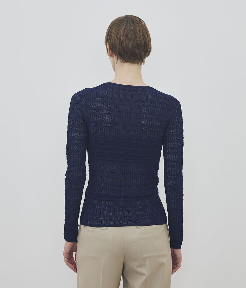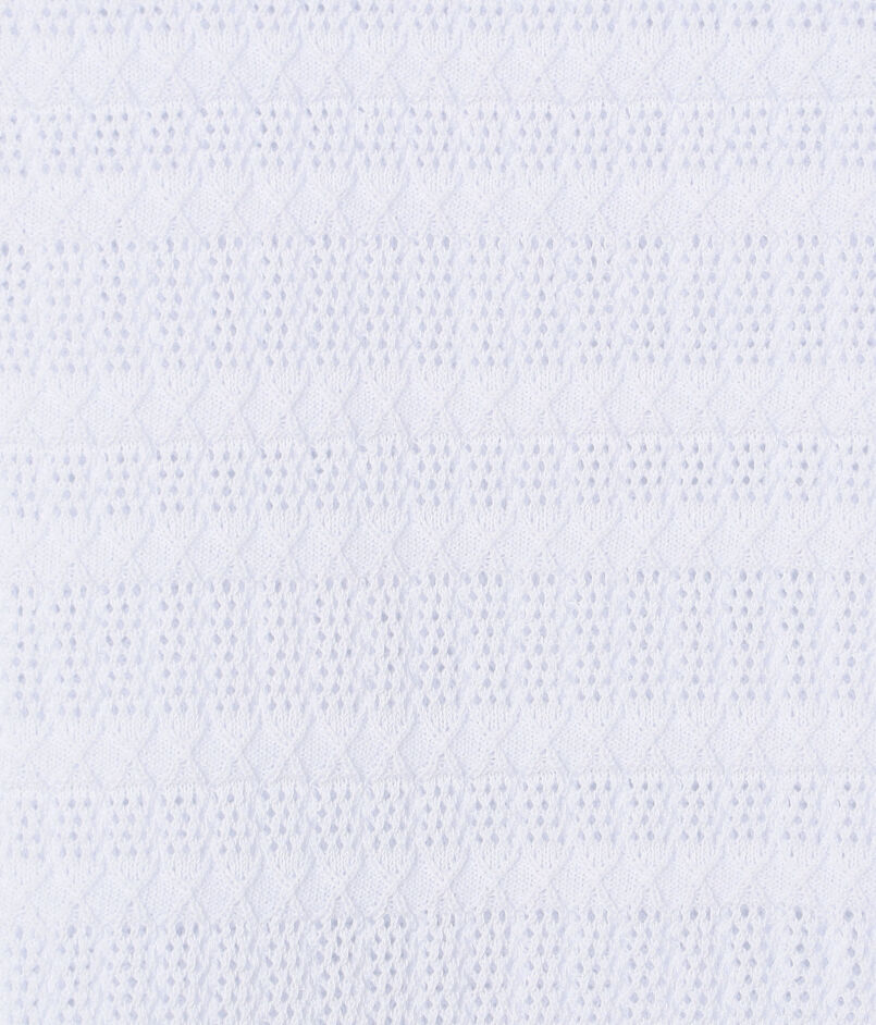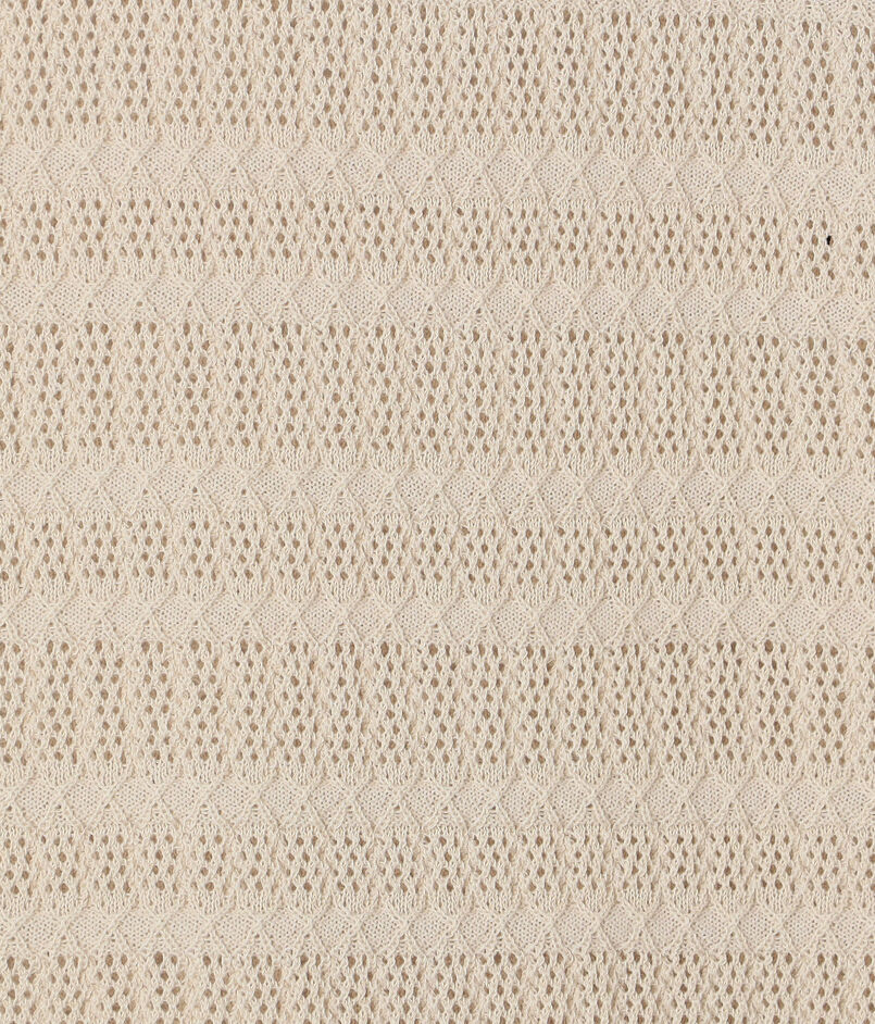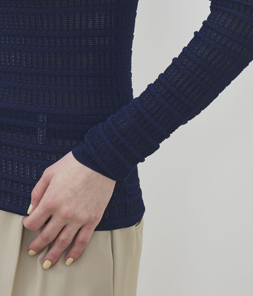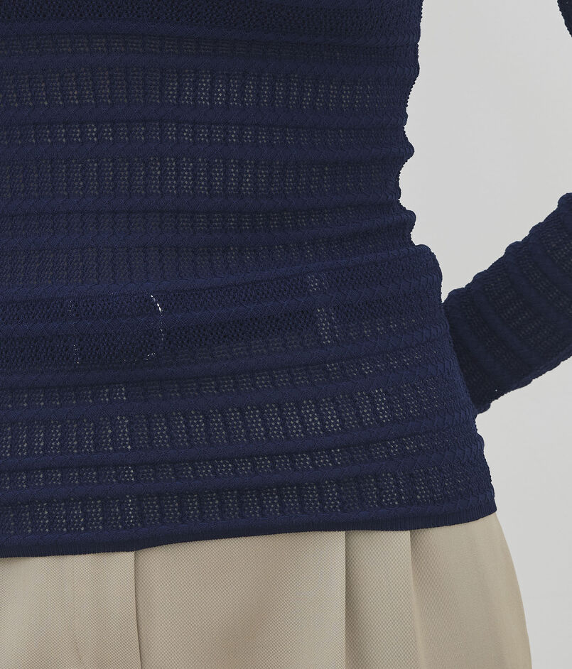 今季はスモッキング刺繍のような奥行きを感じさせるアイレットリブ柄にアレンジし、軽やかな質感に仕上げています。