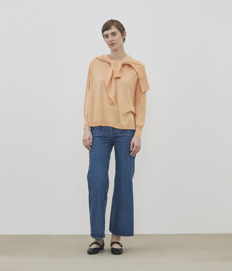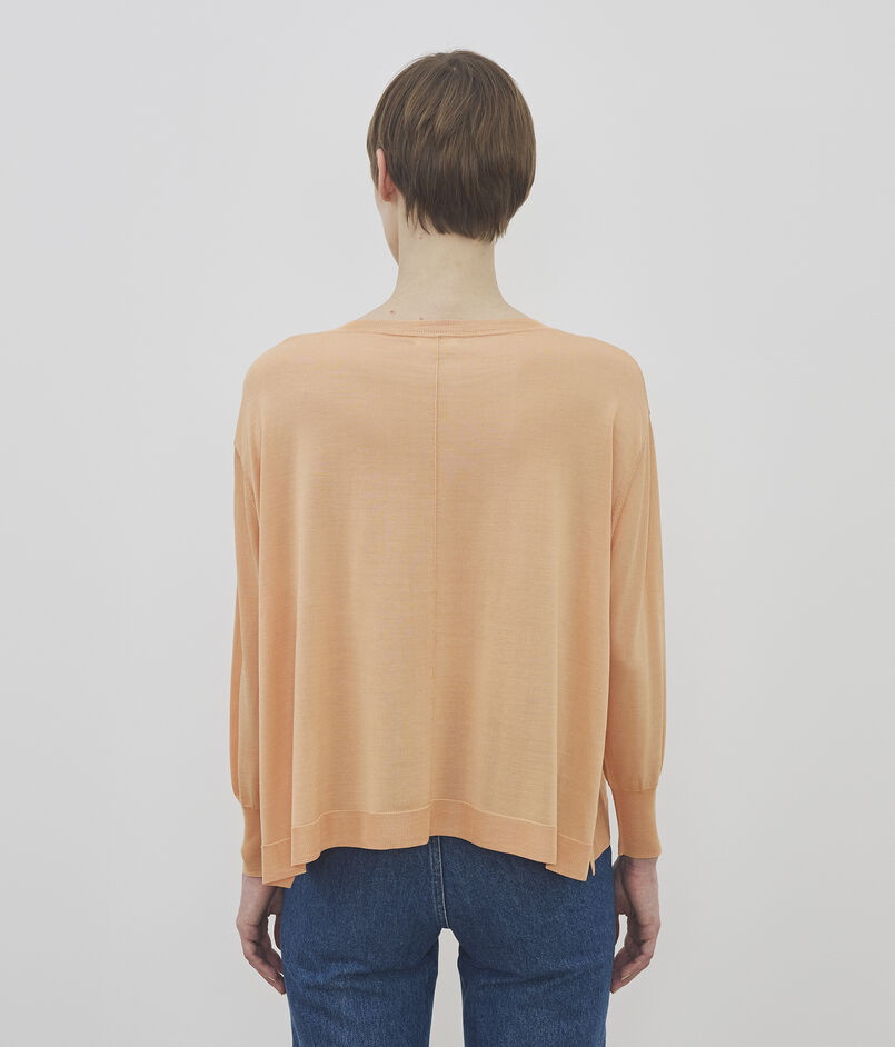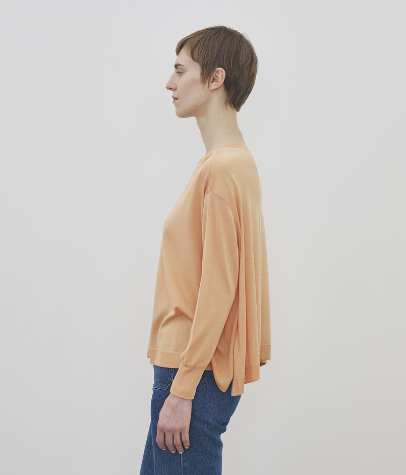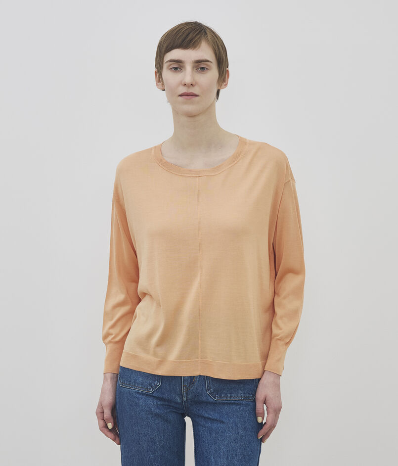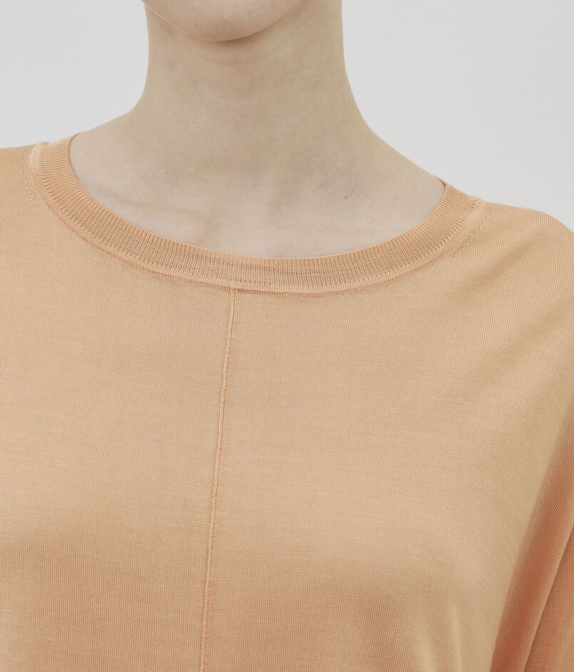 ゆったりとしたリラックスシルエットのラウンドネックプルオーバーは着用すると生まれる自然なドレープが美しい一着。