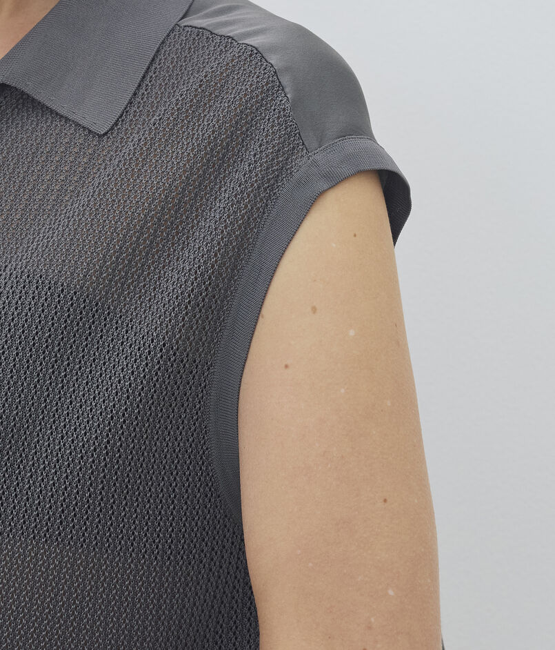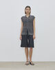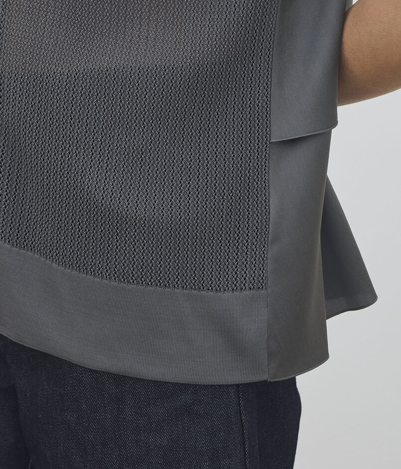シルクのような滑らかな肌触りと控えめな光沢が特徴のフィラメント糸で編み上げたニット素材と高級感のある光沢と美しいドレープが特徴のストレッチシルクサテンの布帛素材を使用した異素材コンビネーションシリーズ。