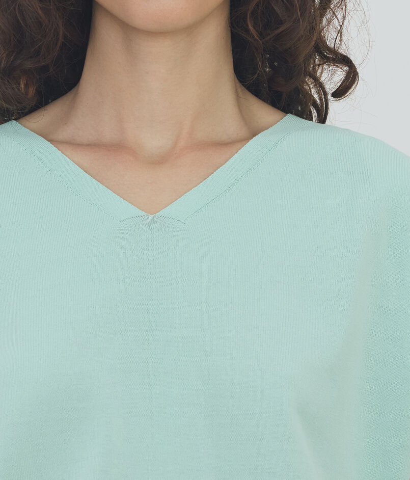 前後どちらでも着用可能なフロンタブル仕様なのでシャープなVネックとクリーンなクルーネックをその日の気分で選択いただけ、オンからオフまでシームレスに活躍してくれるエフォートレスな一枚。