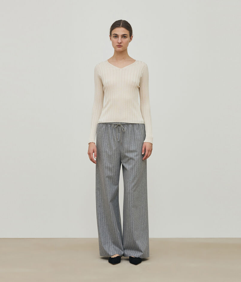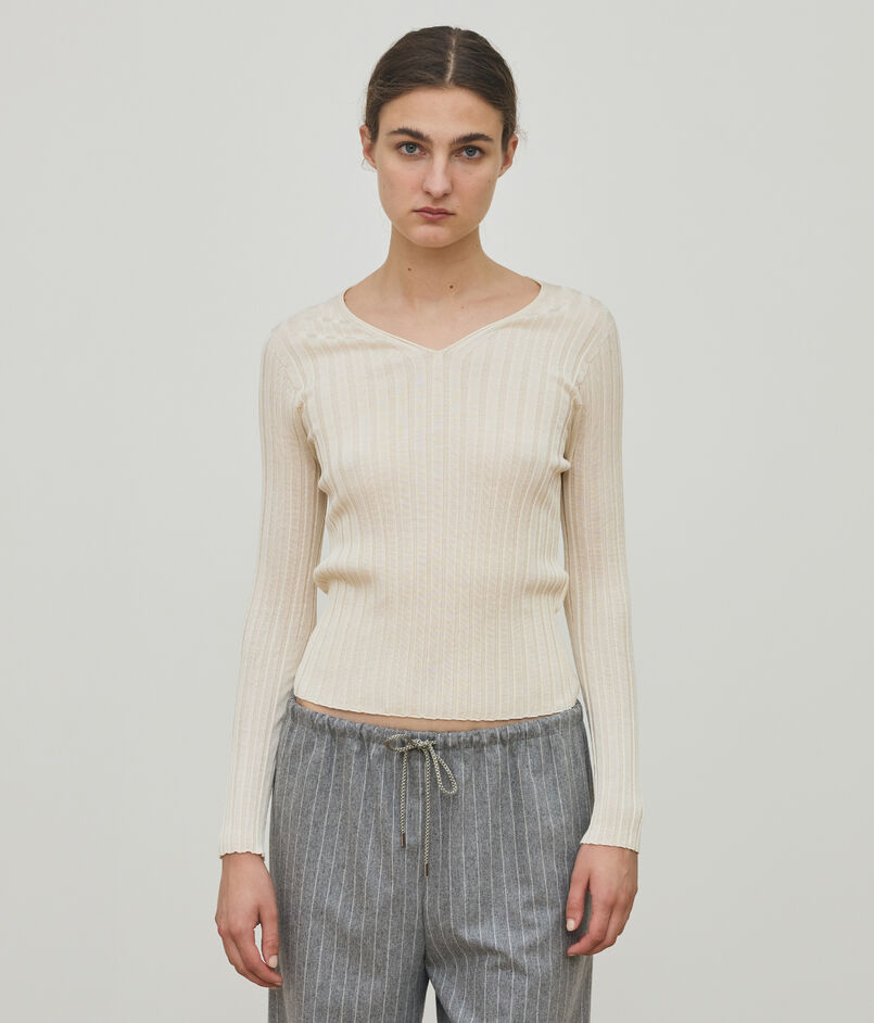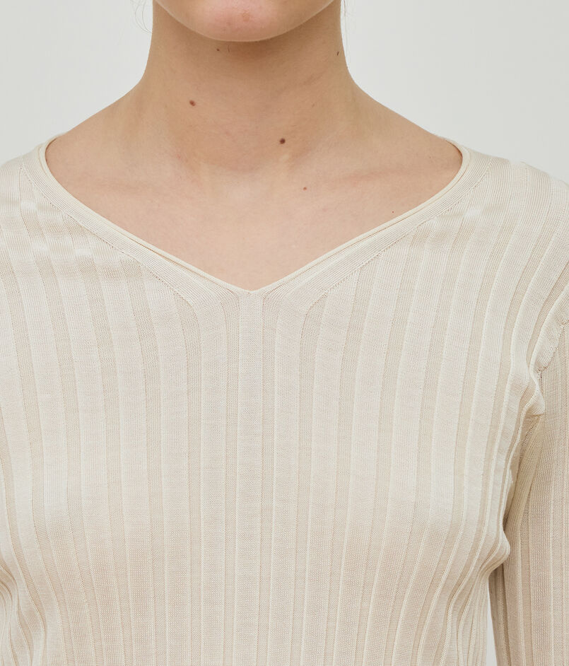 ワイドリブに編み立てることで適度にゆるっとした雰囲気のあるVネックプルオーバー。