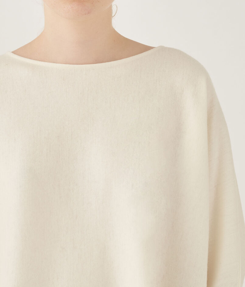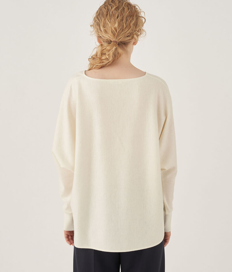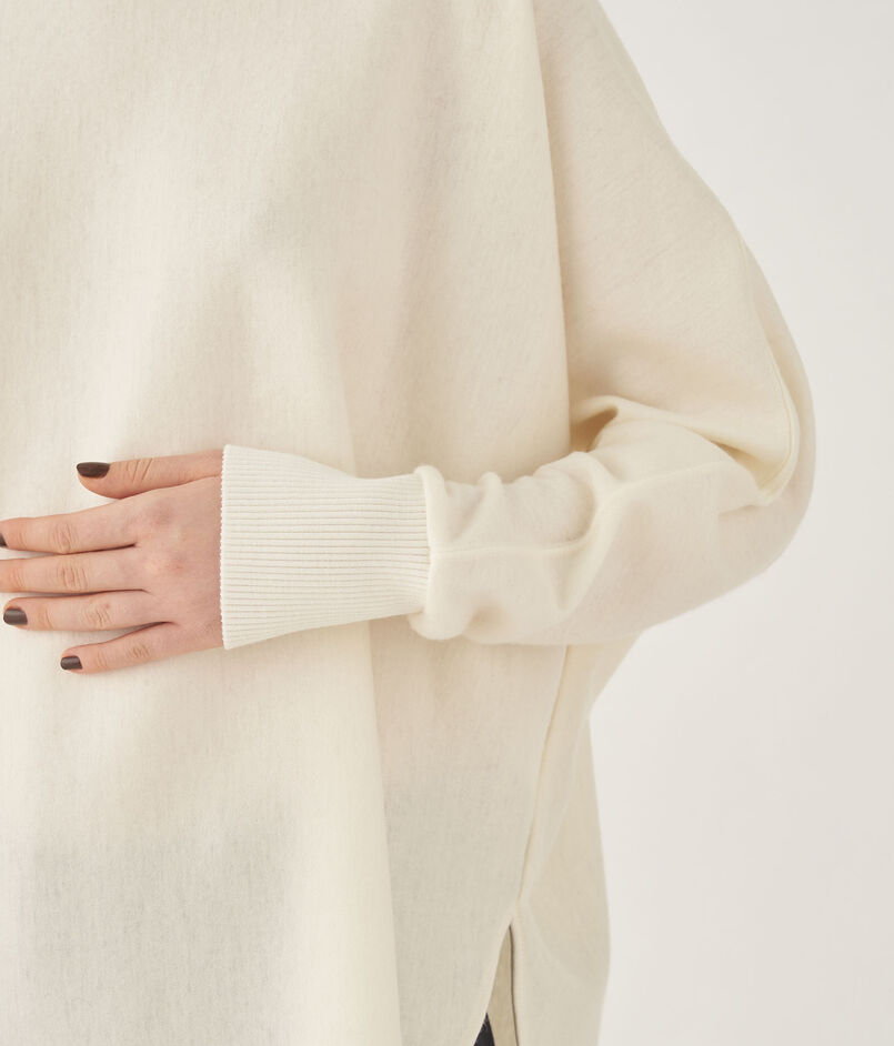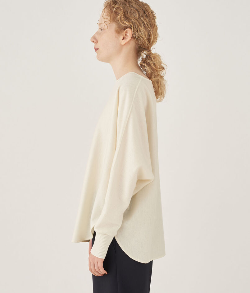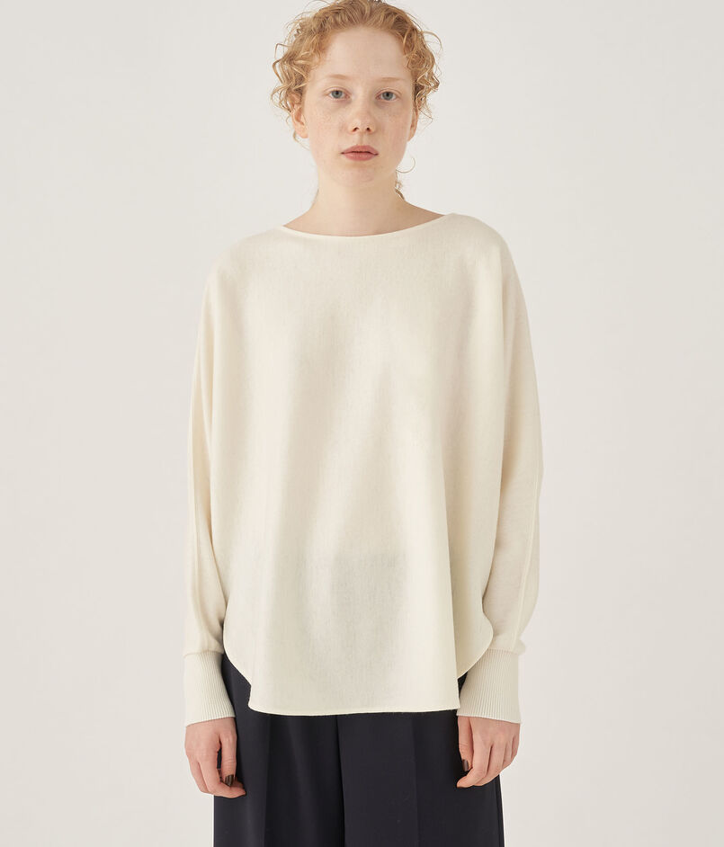 プルオーバーはボクシーなシルエットにやや広めのネックライン、ドルマンスリーブのデザインでリラックスムード漂うバランスに。
