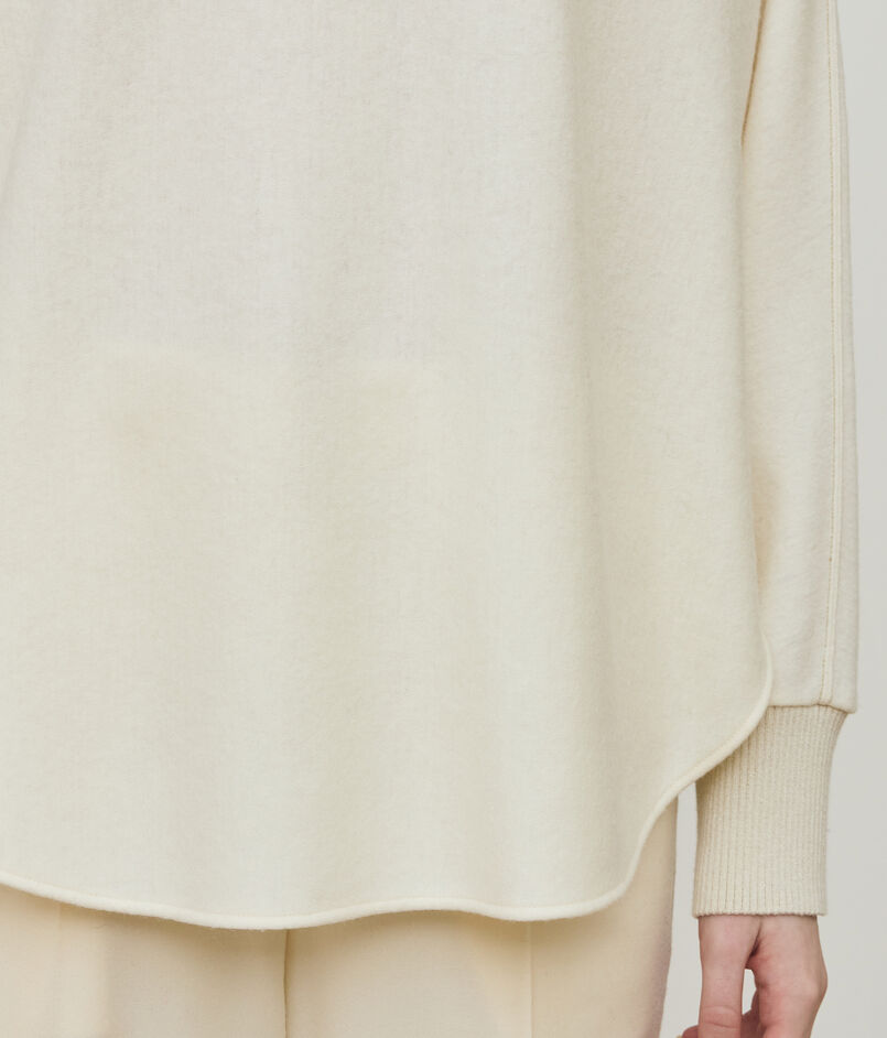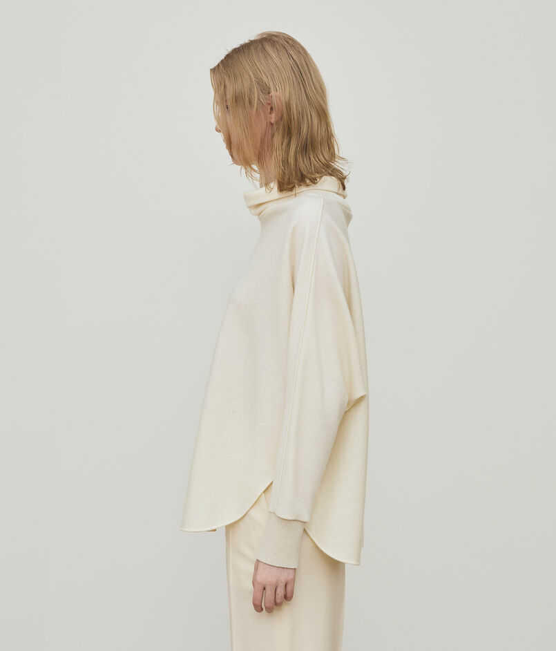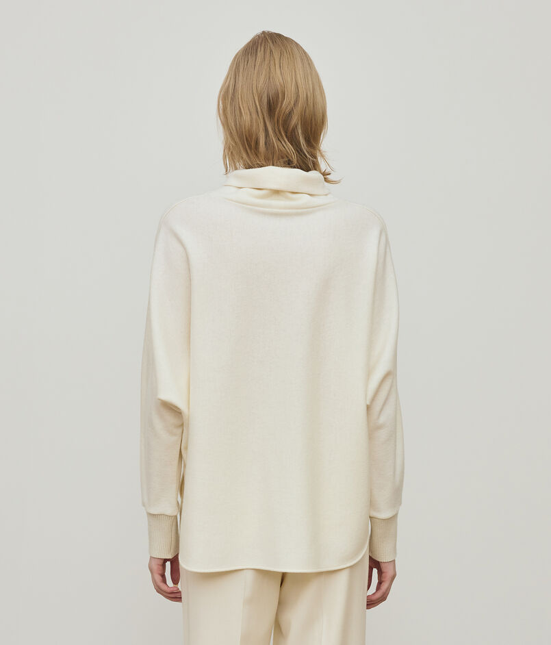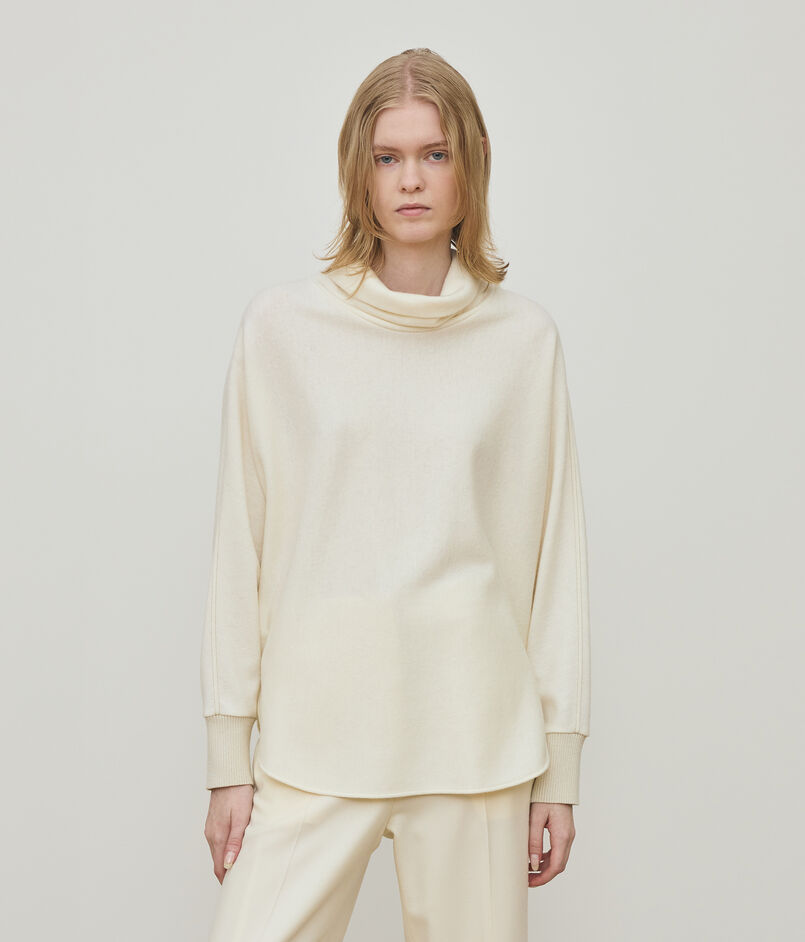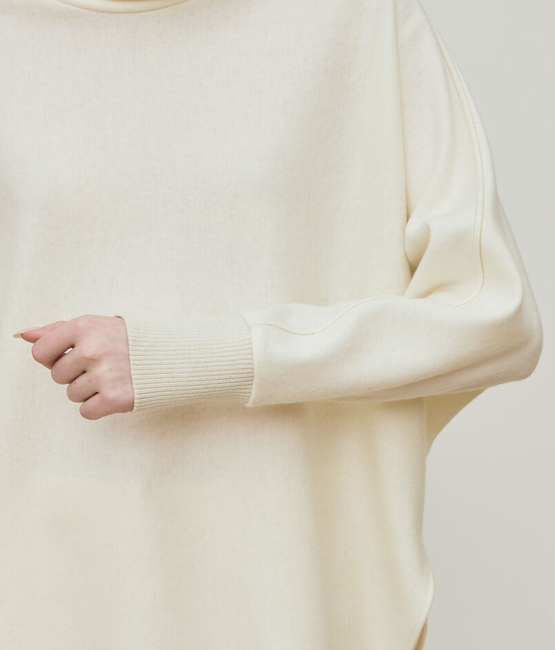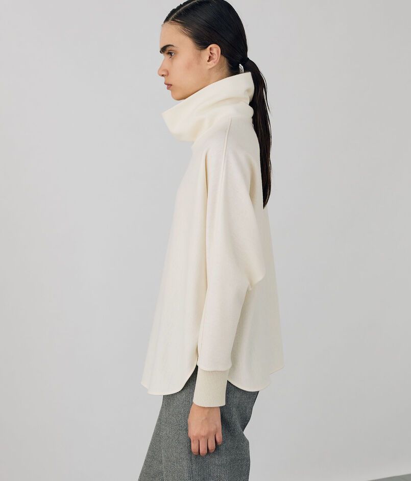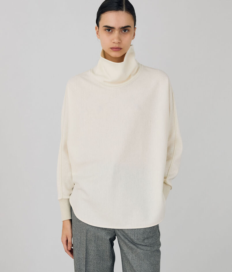 タートルネックプルオーバーはボクシーなシルエットにルーズなハイネック、ドルマンスリーブのデザインでリラックス感のある雰囲気に仕上げた一枚。