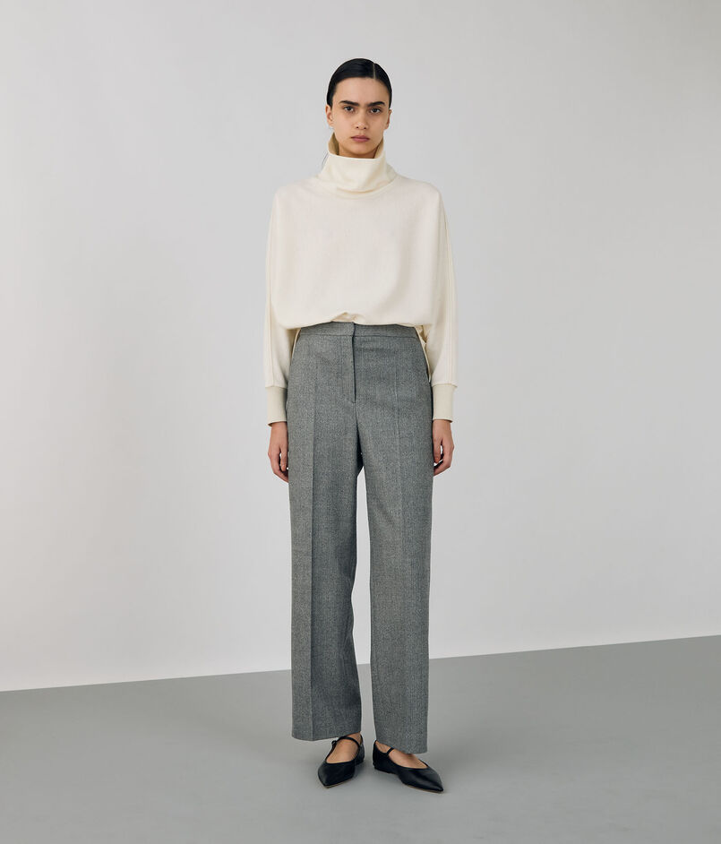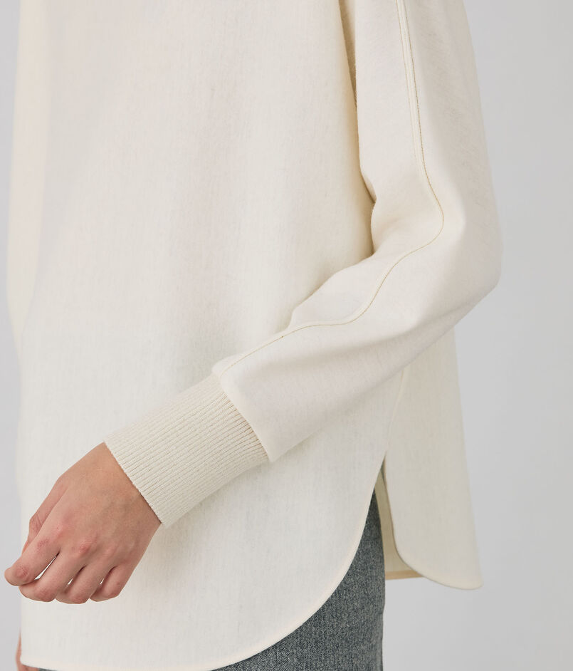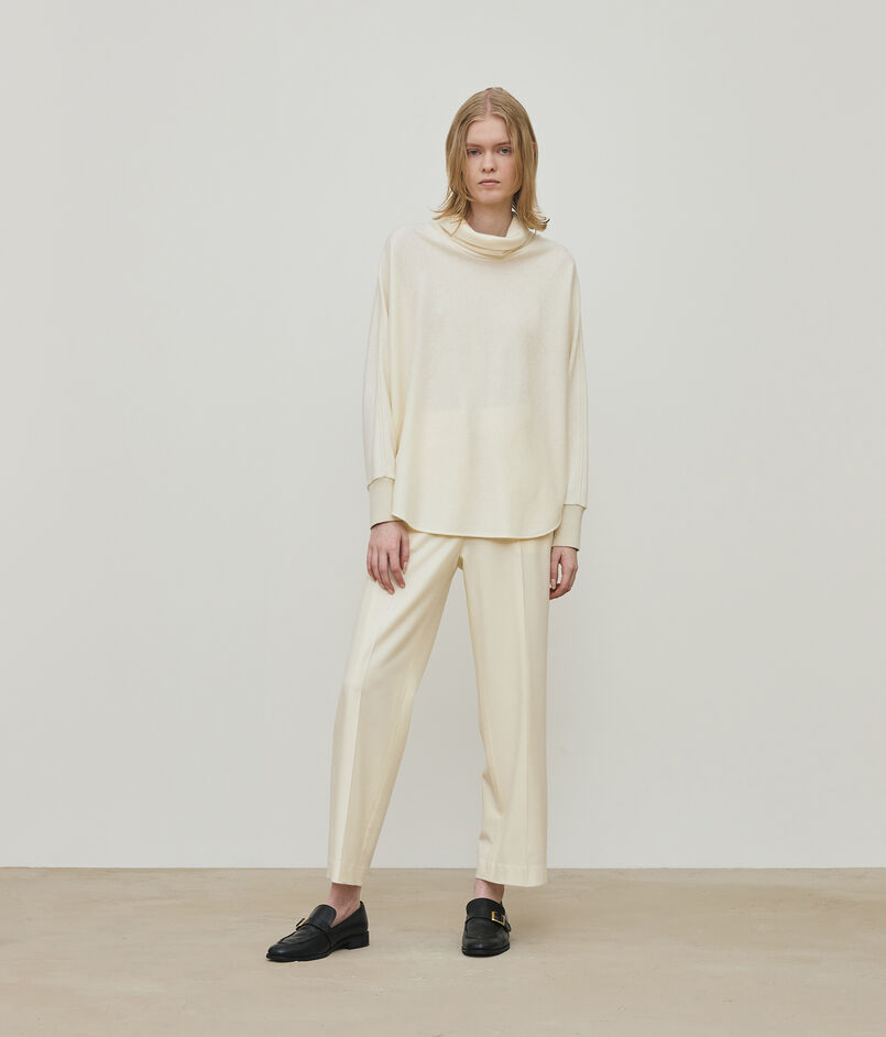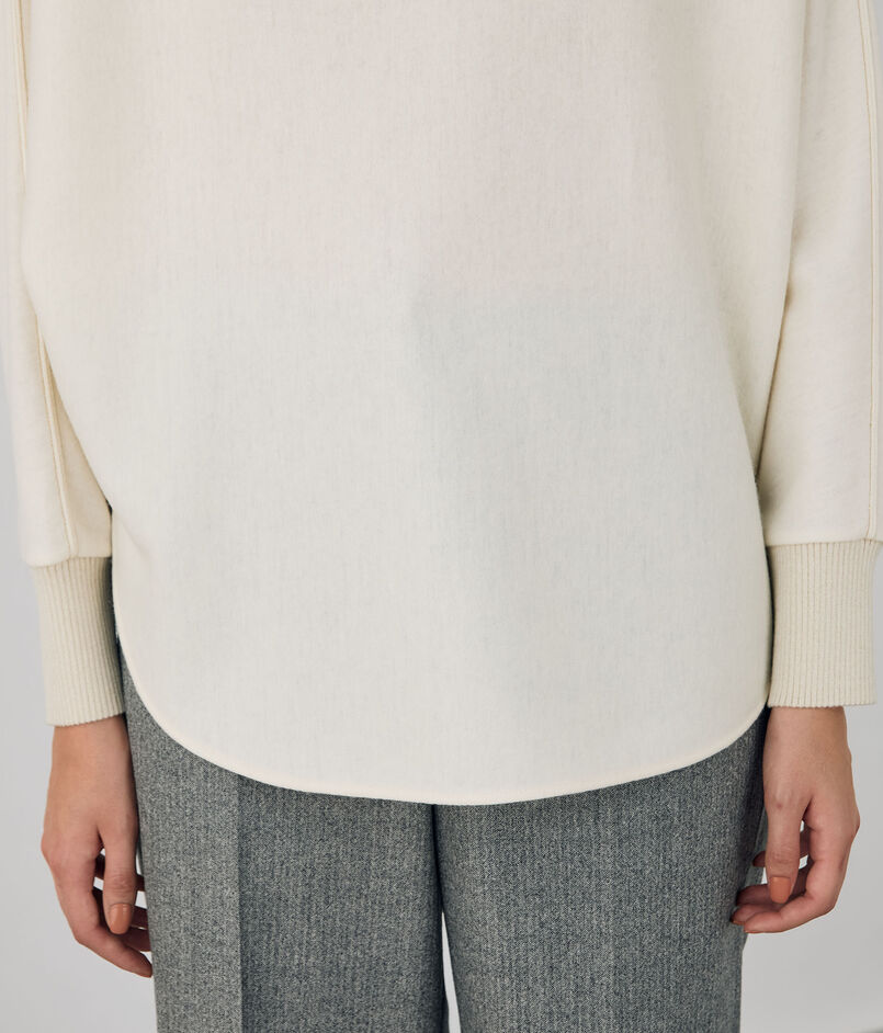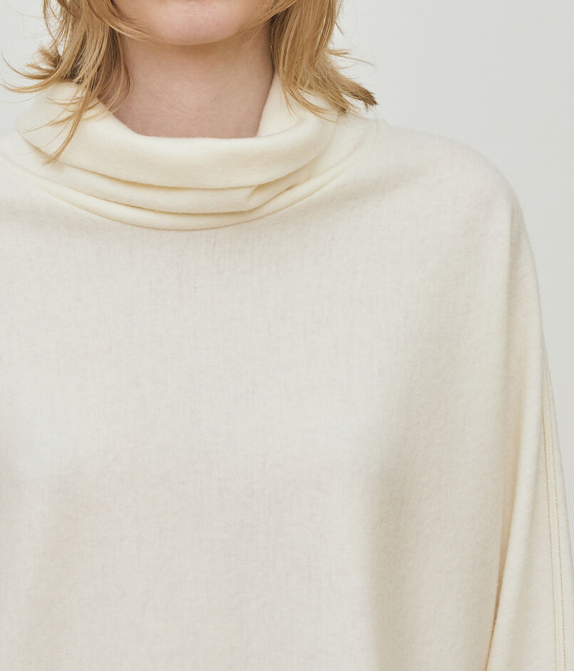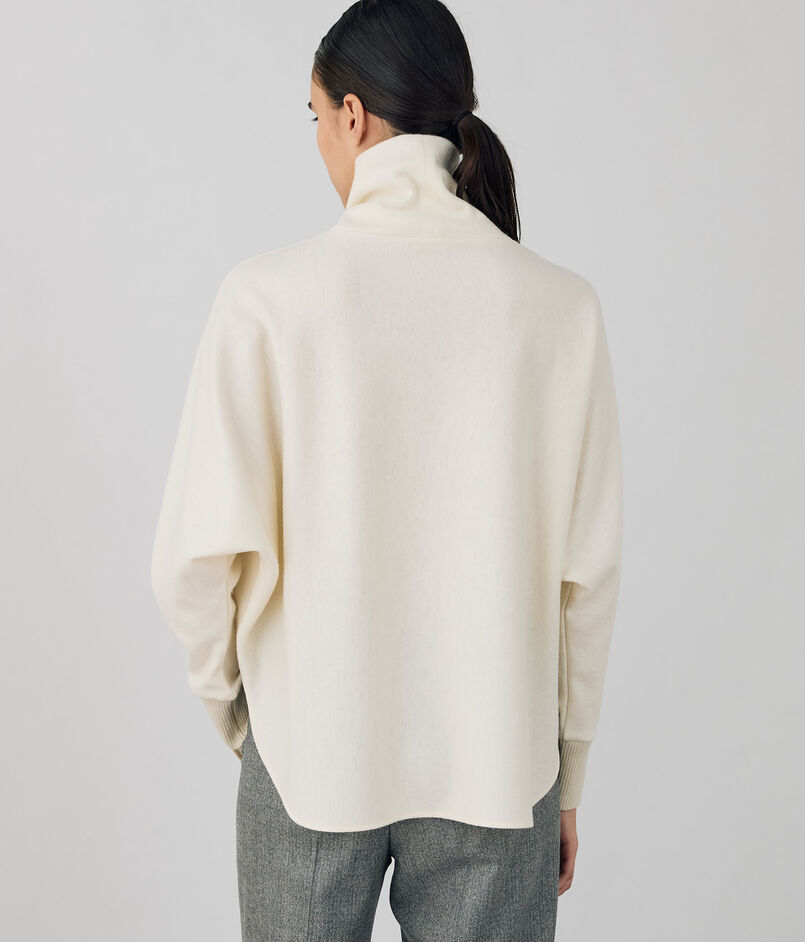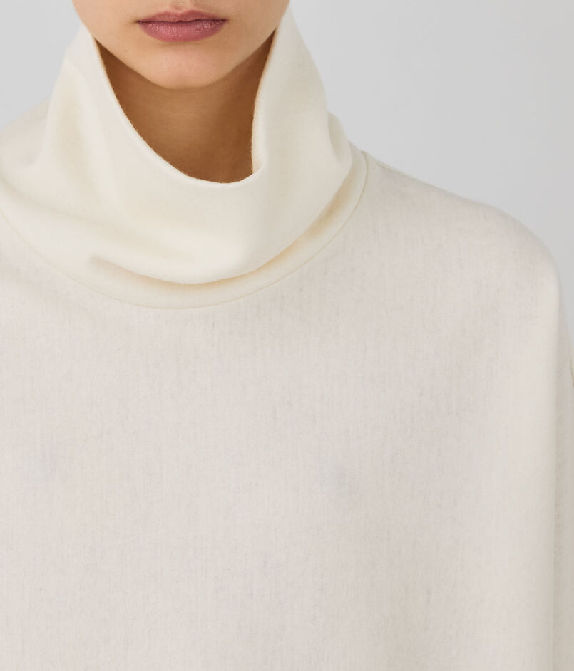 タートルネックプルオーバーはボクシーなシルエットにルーズなハイネック、ドルマンスリーブのデザインでリラックス感のある雰囲気に仕上げた一枚。