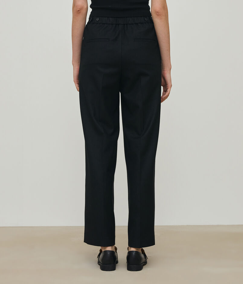 両サイドに配したボタンでウエストをアジャストでき、着こなしに合わせてサイズを微調整できるのもうれしいポイントです。