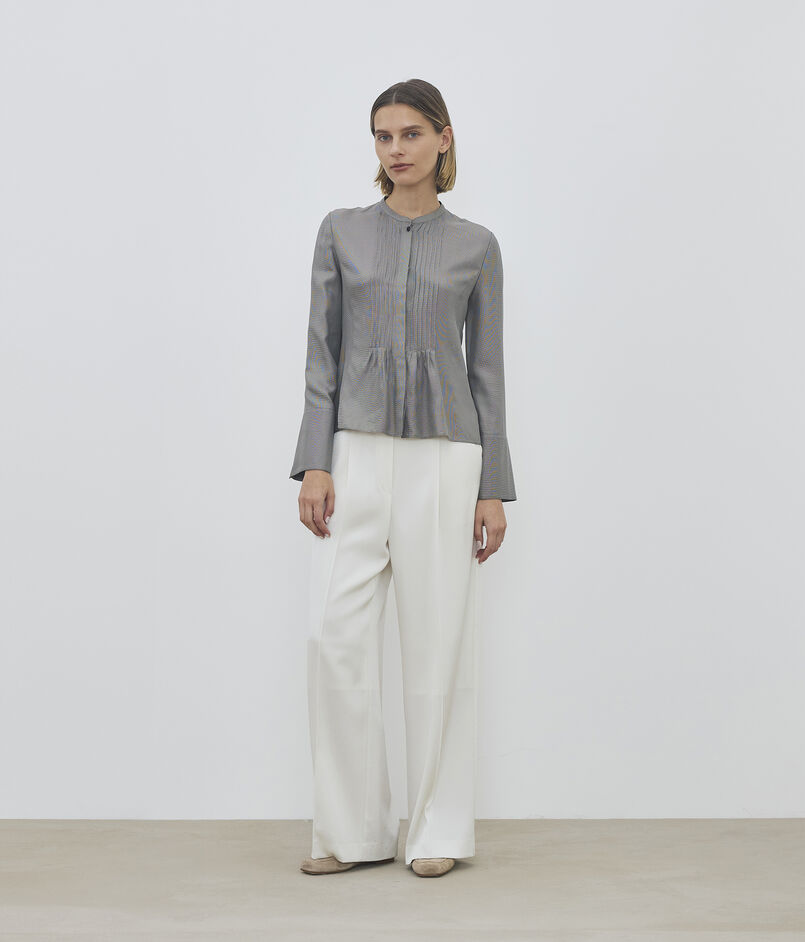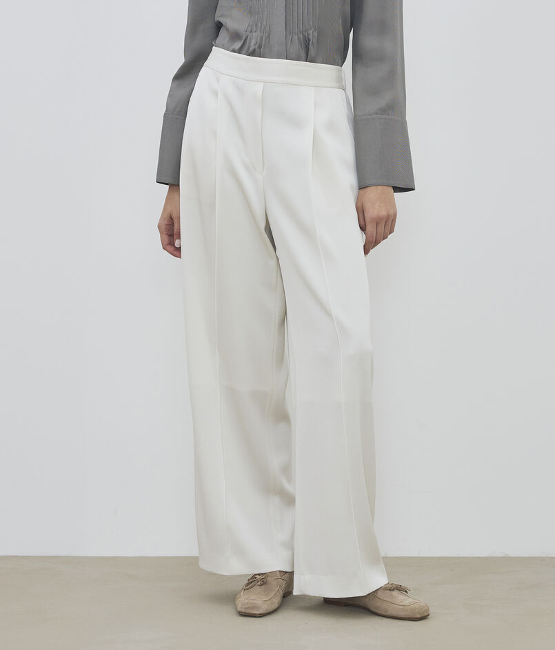 パンツはフロントに施したタックでボリュームを持たせつつも、ハイウエスト位置で絞ることでメリハリをつけ女性らしさを感じる美しいバランスに。