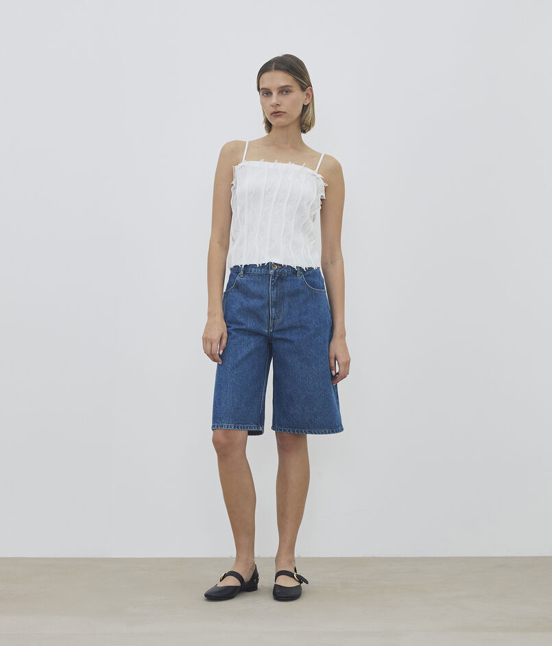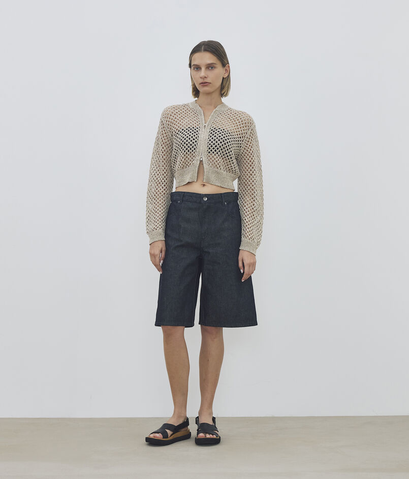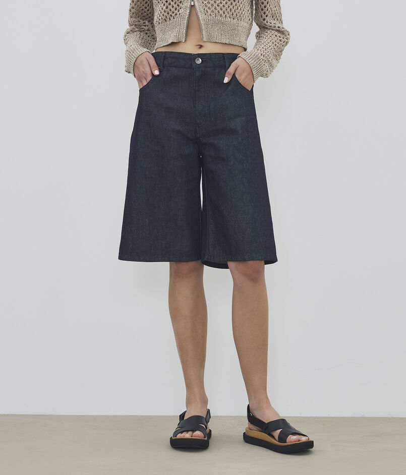 計算されたレッグラインがハーフパンツ特有の幼さを削ぎ落とし、大人の女性に相応しいモダンなバランスに仕上げています。