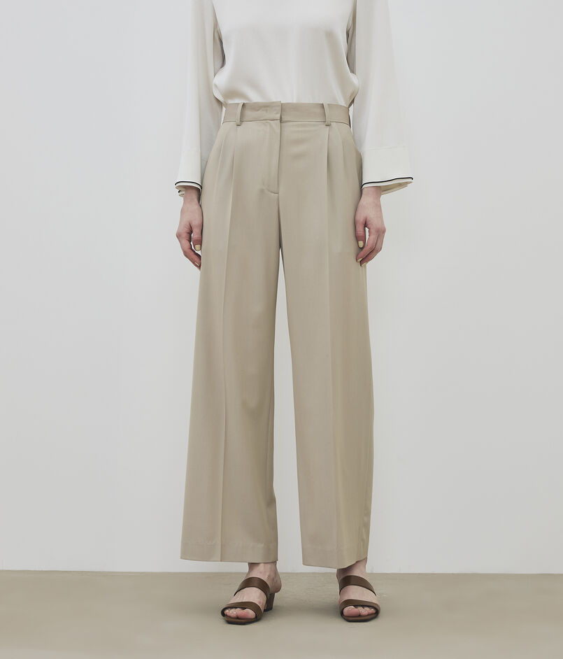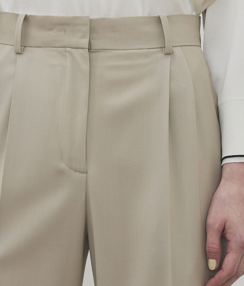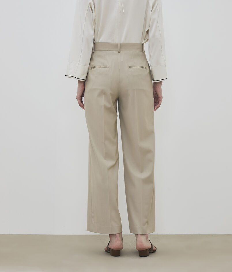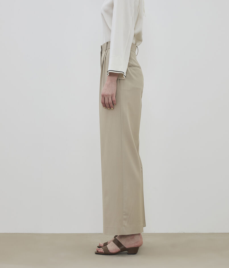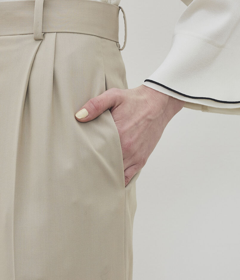 タックパンツはフロントに施したタックに高めのウエスト位置でマニッシュかつフォーマルな印象の一着。