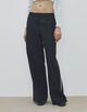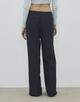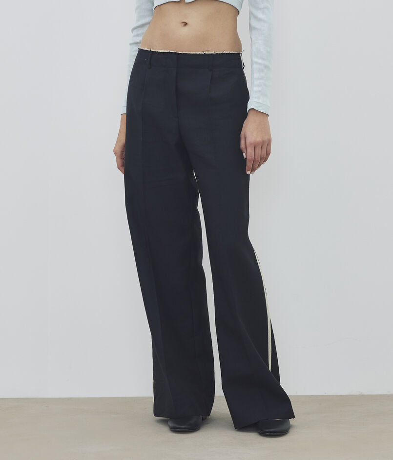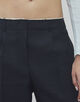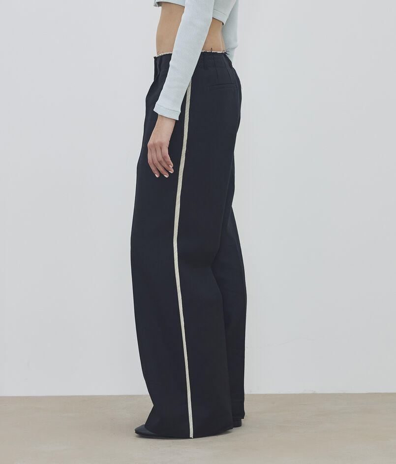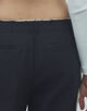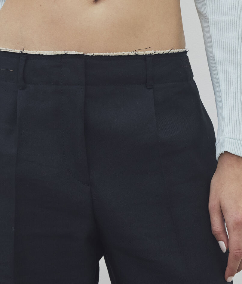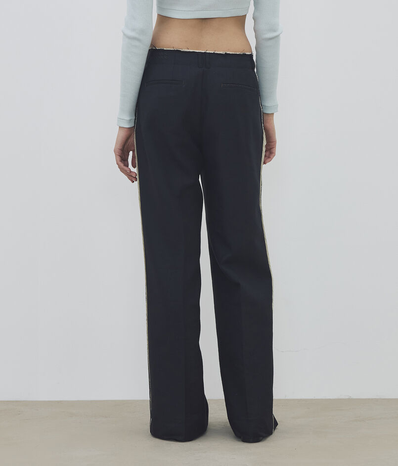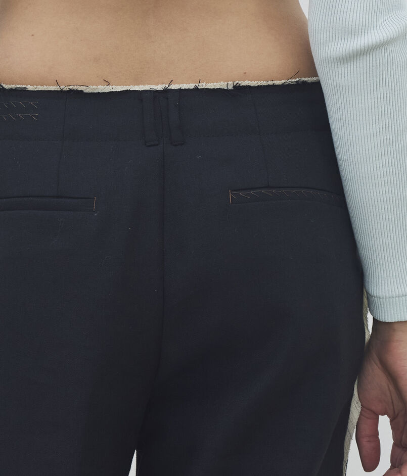 ウエストのカットオフディテールとサイドに配された毛芯のラインがデザインポイント。