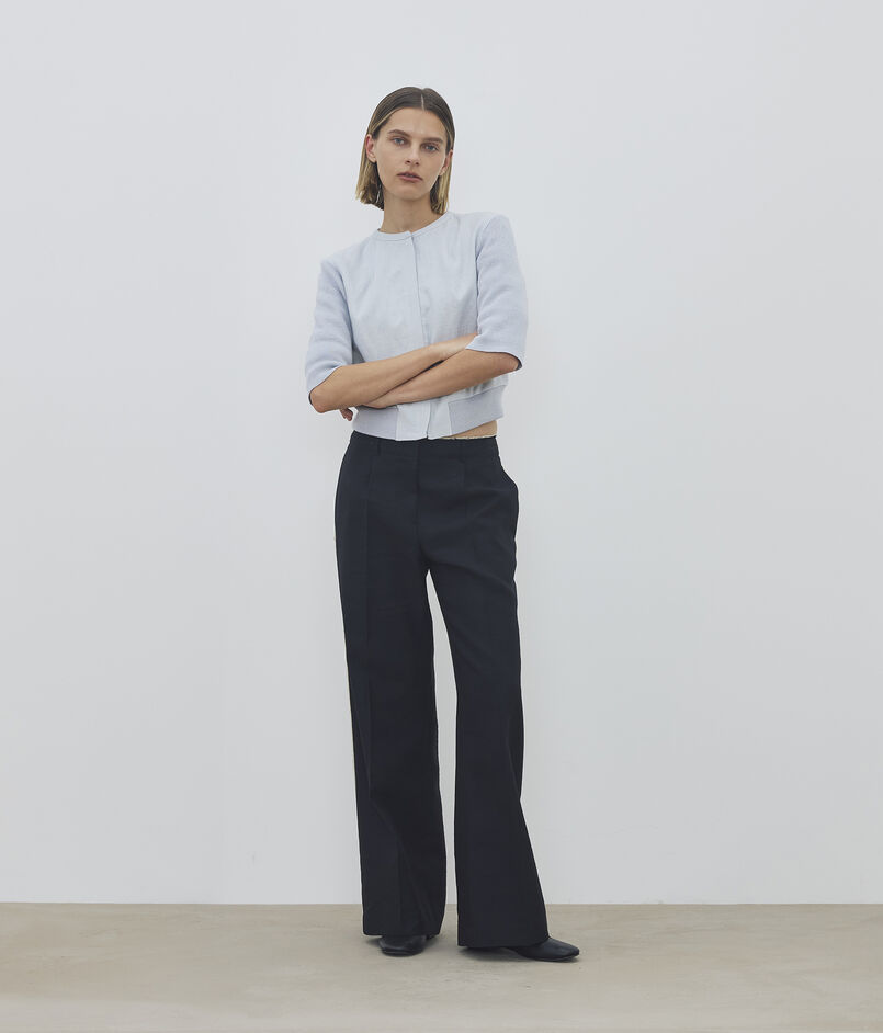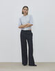タテ糸にリネン、ヨコ糸にウールモヘヤを使用し織り上げた、ハリのある素材感が特徴のパンツ。