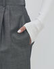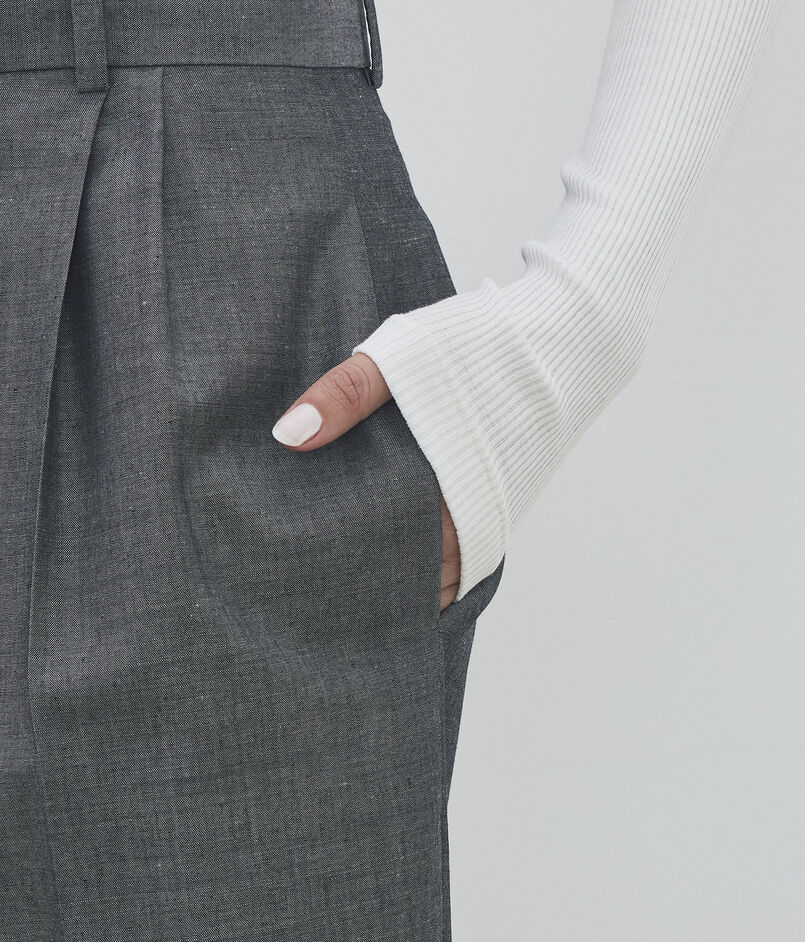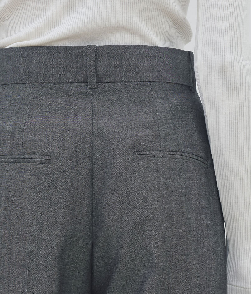 タテ糸にリネン、ヨコ糸にウールモヘヤを使用し織り上げた、ハリのある素材感が特徴のパンツ。