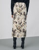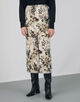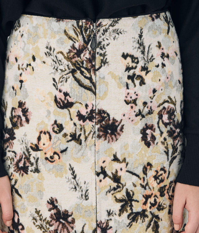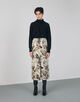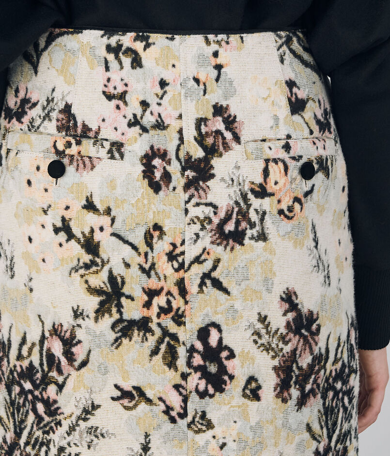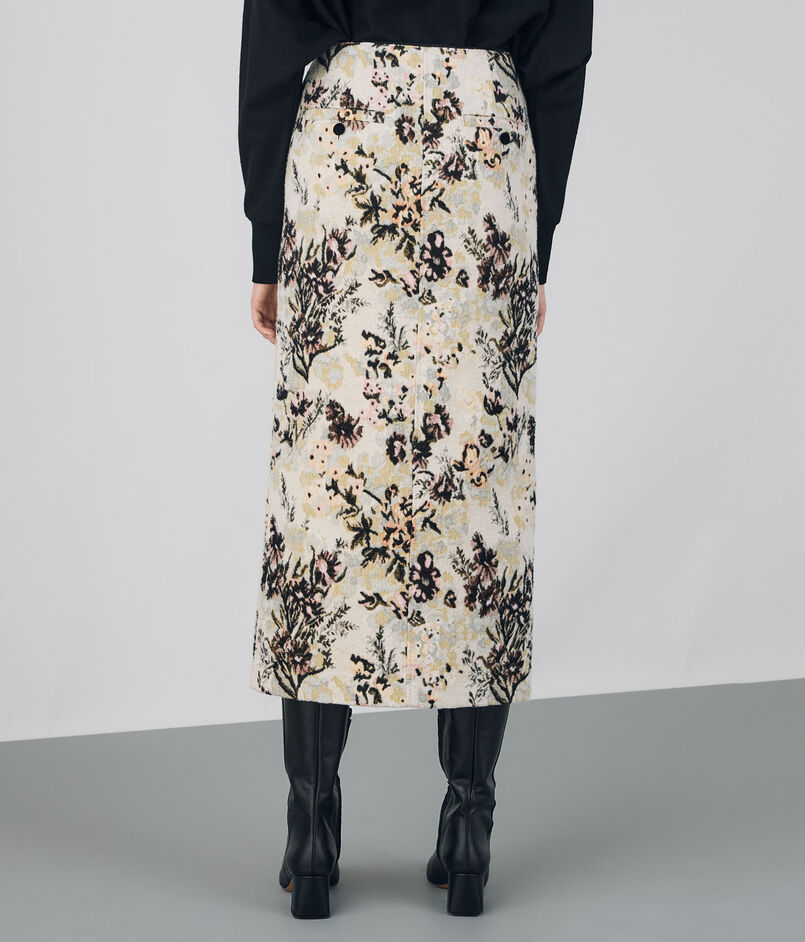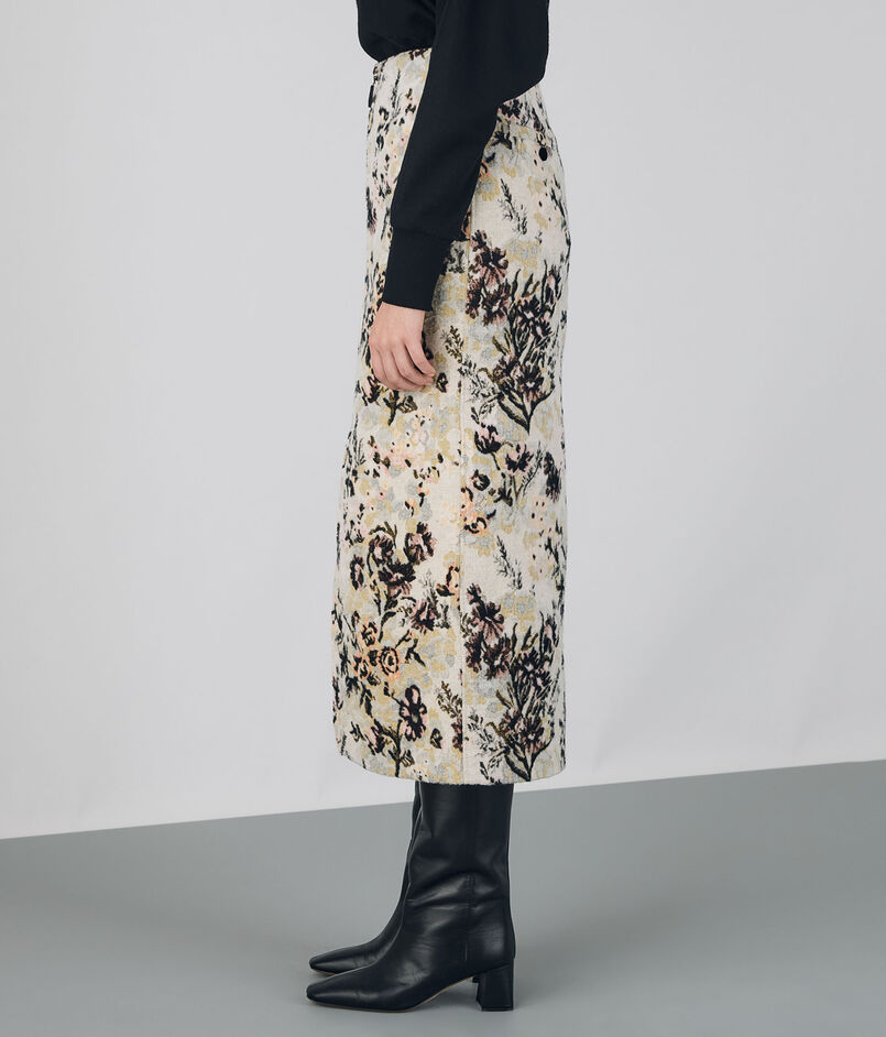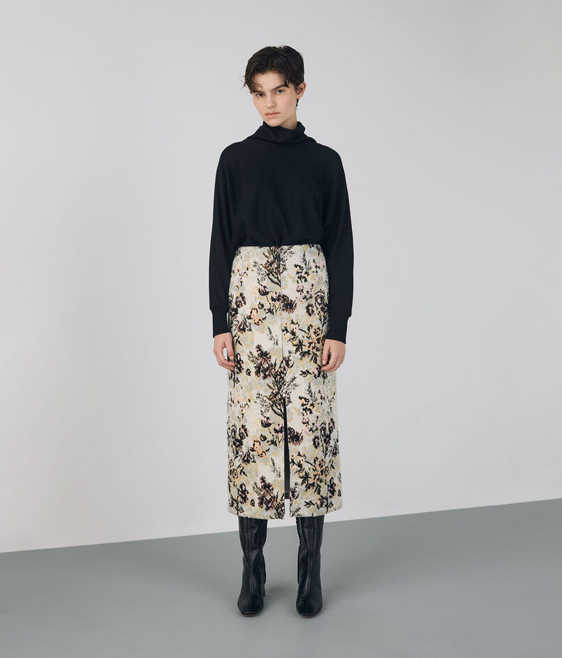 素材の存在感を生かしたシンプルなIラインシルエットのスカートは、ウエストにブラックのベルベット付属をつけることでほど良く全体を引き締めた一着。