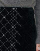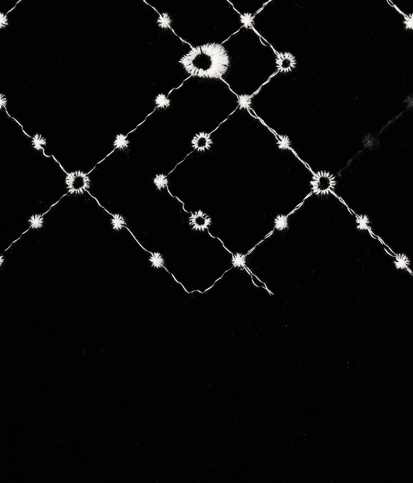 ホールが組み合わされたダイアモンドのケージのような柄を白黒の2色でレイアウトし、生地の半分は無地にして、抜け感のあるレイアウトをイメージして仕上げています。