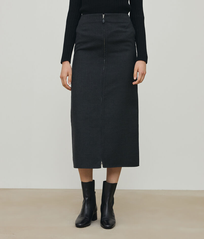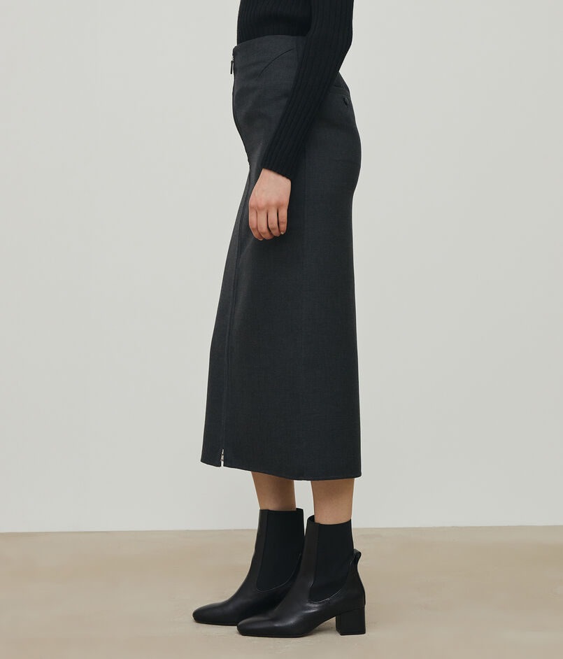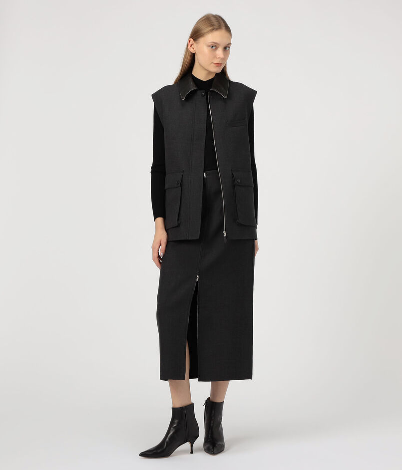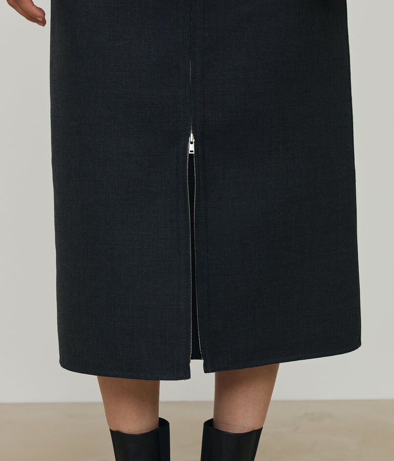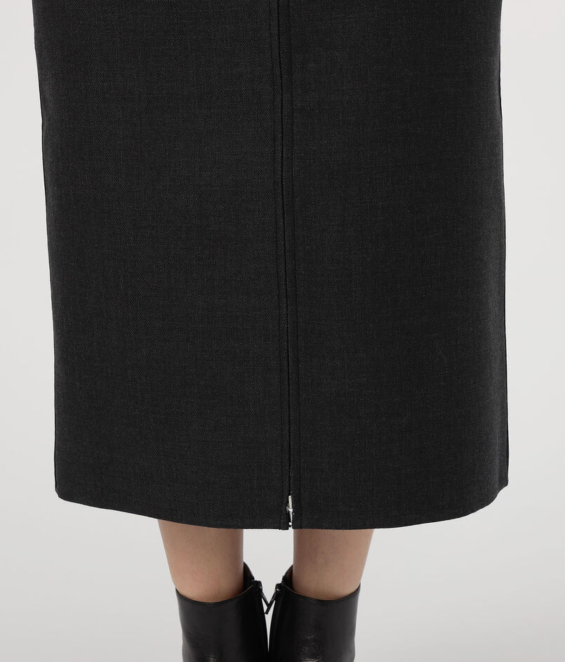 ジップアップのタイトスカートは裏地がなく軽い履き心地なので、スカートとしての着用はもちろん、ジップを深めに開けてパンツの上に重ね着するのもおすすめです。