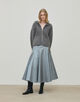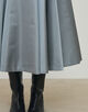 大胆なボリュームのフレアスカートは、ウエスト周りがすっきりしているのでバランスよく着用でき、フェミニンになりすぎないのもポイント。光沢感があるので、毛足の長いニットなど冬の素材に合わせやすく、コーディネートの幅が広がる一枚です。