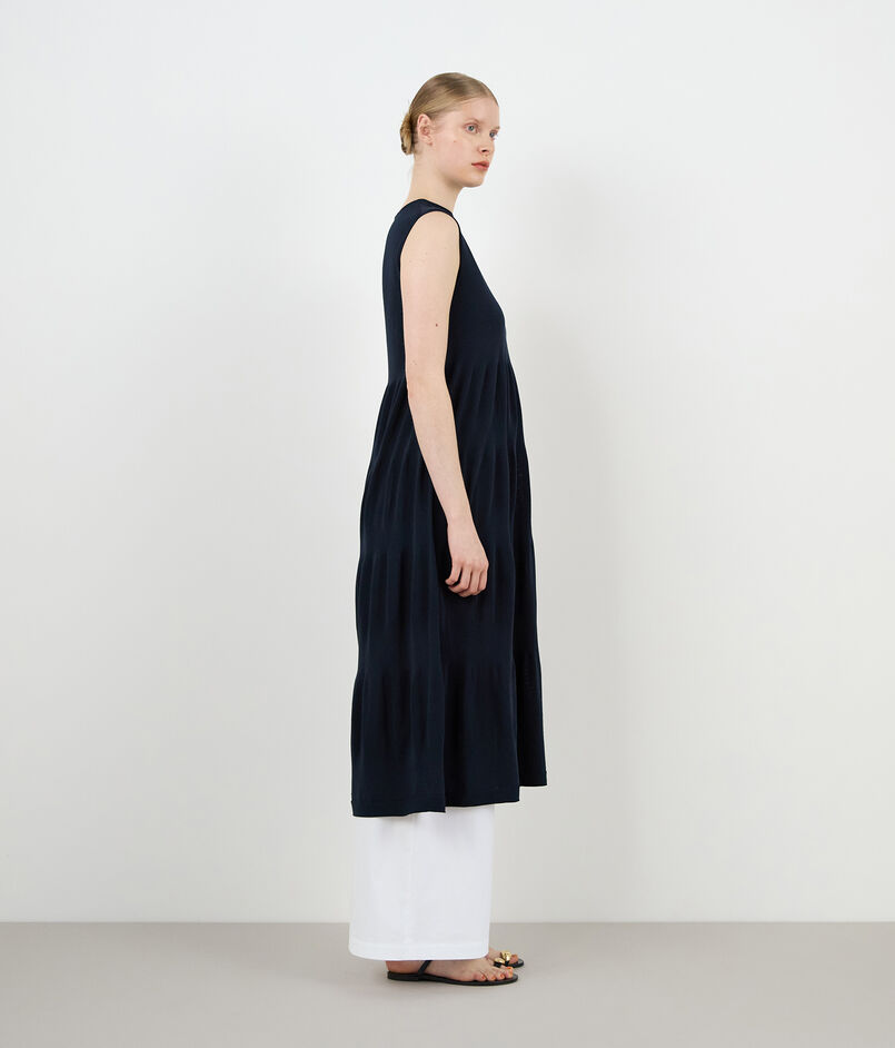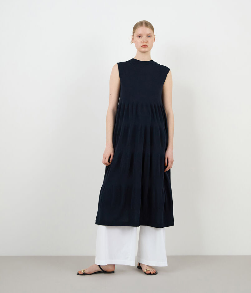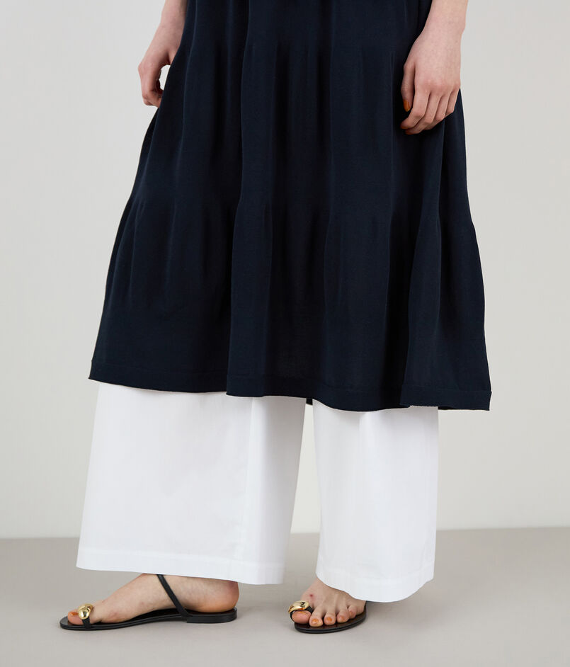 ニット編みならではのテクニックでギャザーを寄せたようなティアードフレアのシルエットを表現した一枚。