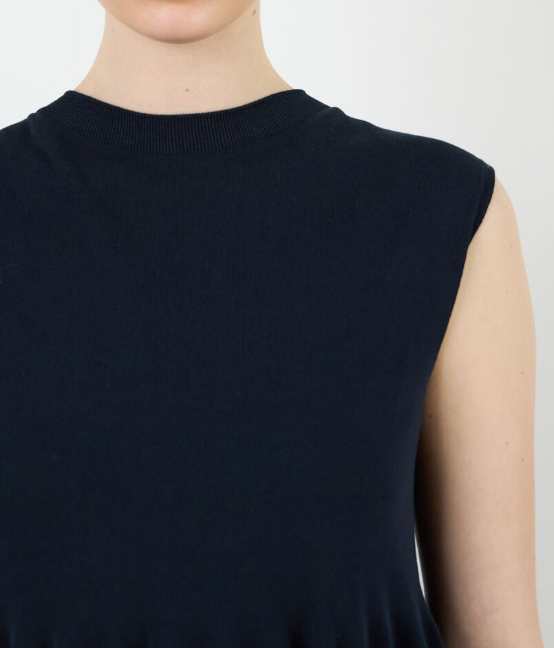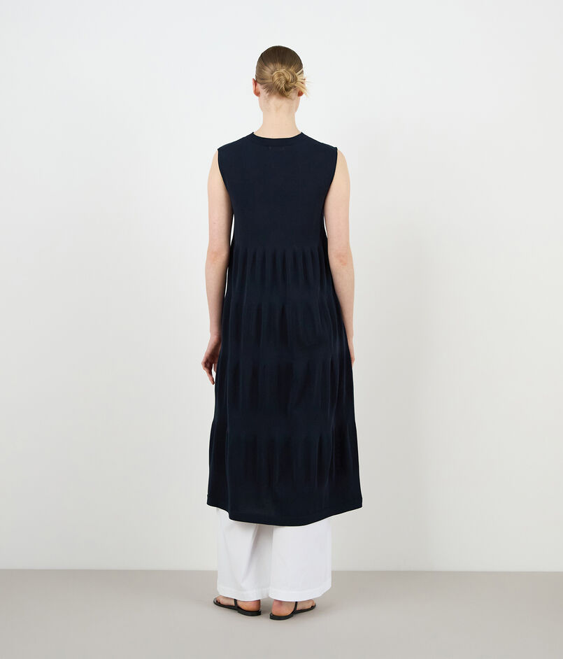 細番手のコットン糸とストレッチ性のあるポリエステル糸を撚糸しホールガーメント編み機で編み上げたワンピース。