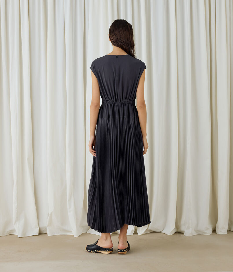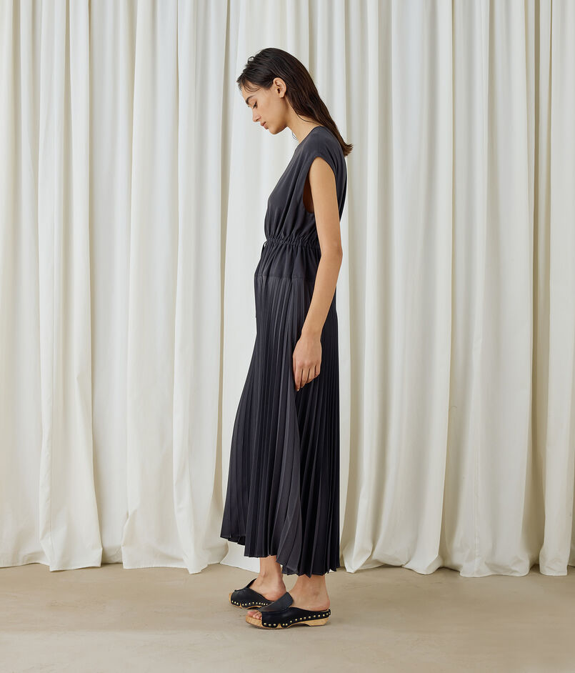 プリーツコンビドレスはアコーディオンプリーツとのコンビネーションタイプで、動くたびに揺れ動くプリーツがとてもきれいなワンピースです。