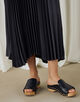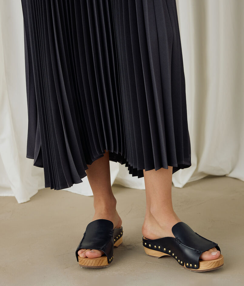 着用やクリーニングの繰り返しで、次第に折り目は甘くなっていきます。長時間プリーツが開いた状態で座るなどはお避けください。