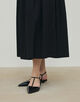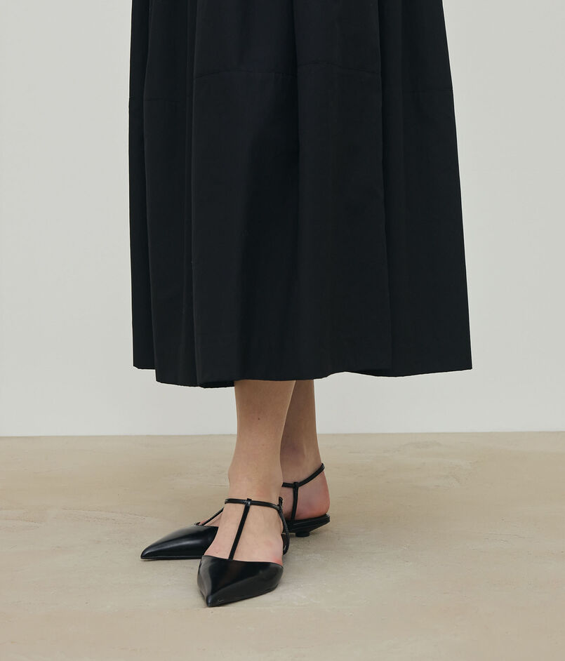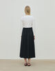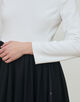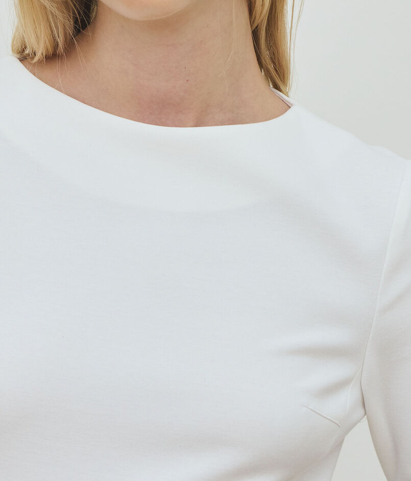 やや立ち上がっているように見えるボートネックで首まわりの表情にシャープさをプラス。