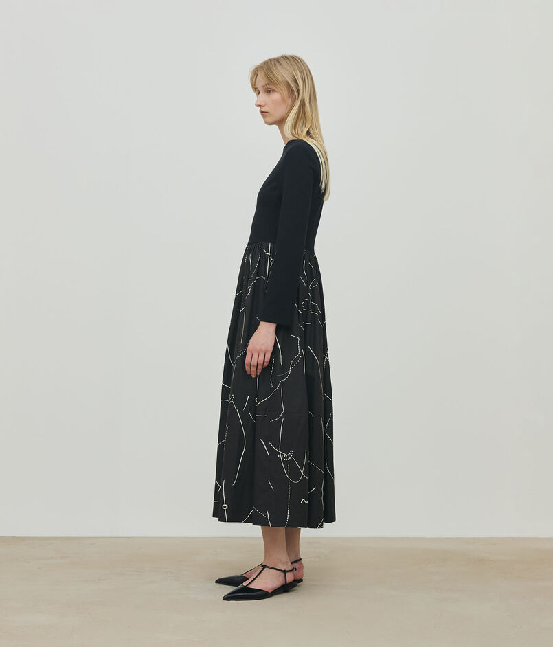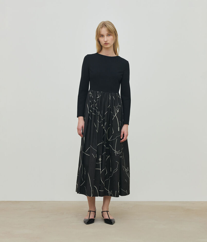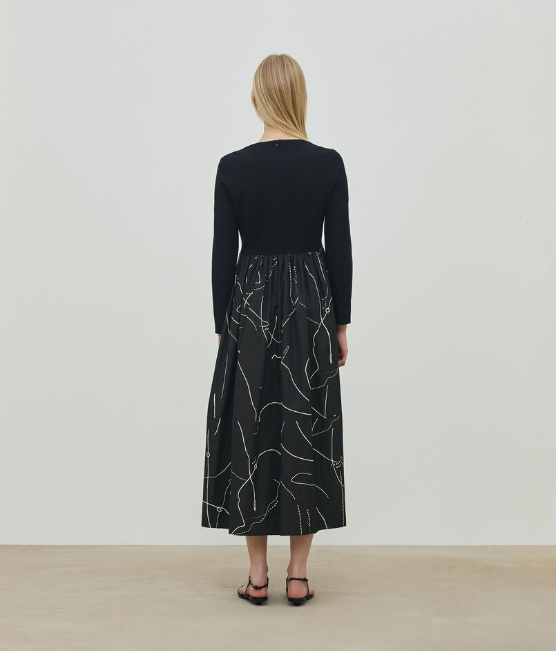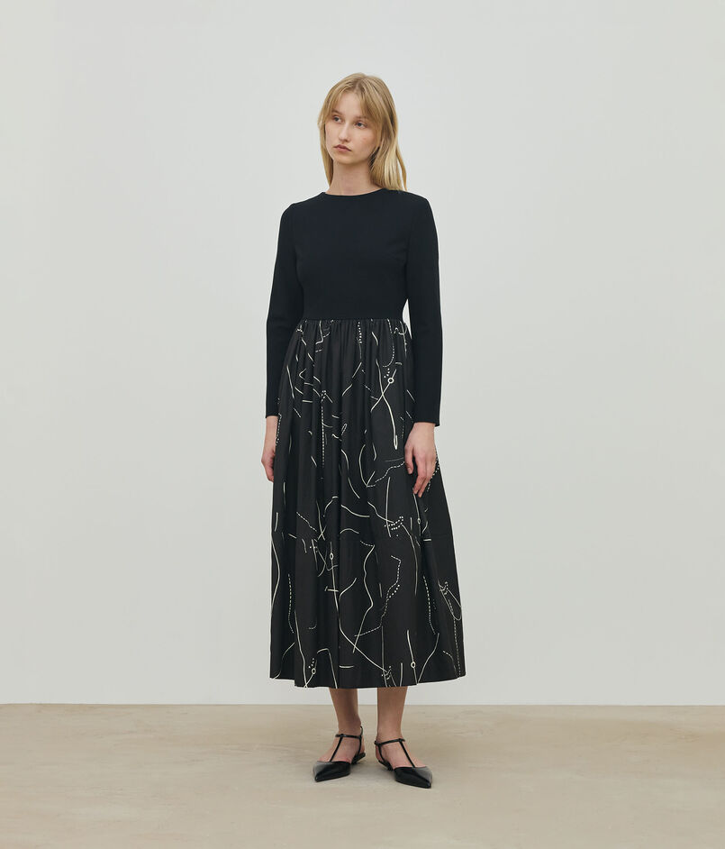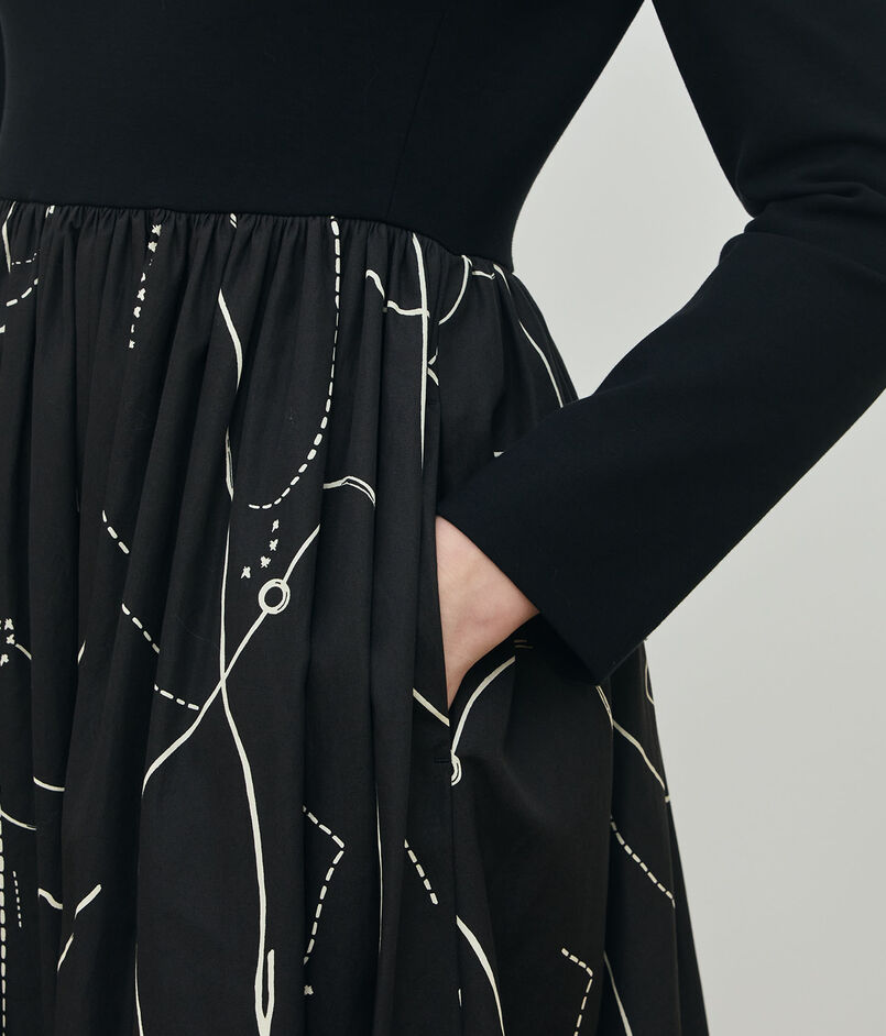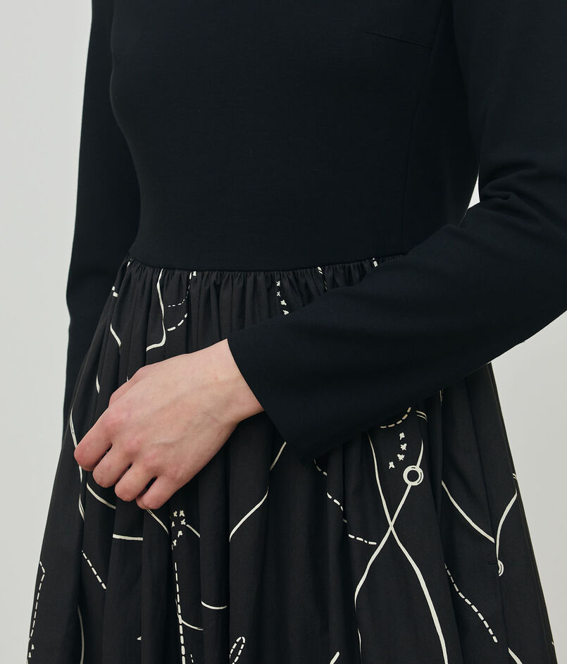 ジャージー部分はダーツを入れて布帛同様に仕立てることで立体感のあるフォルムを生み出しています。