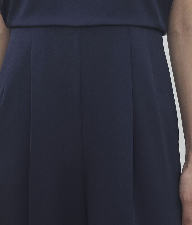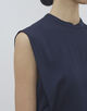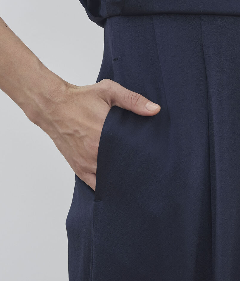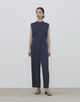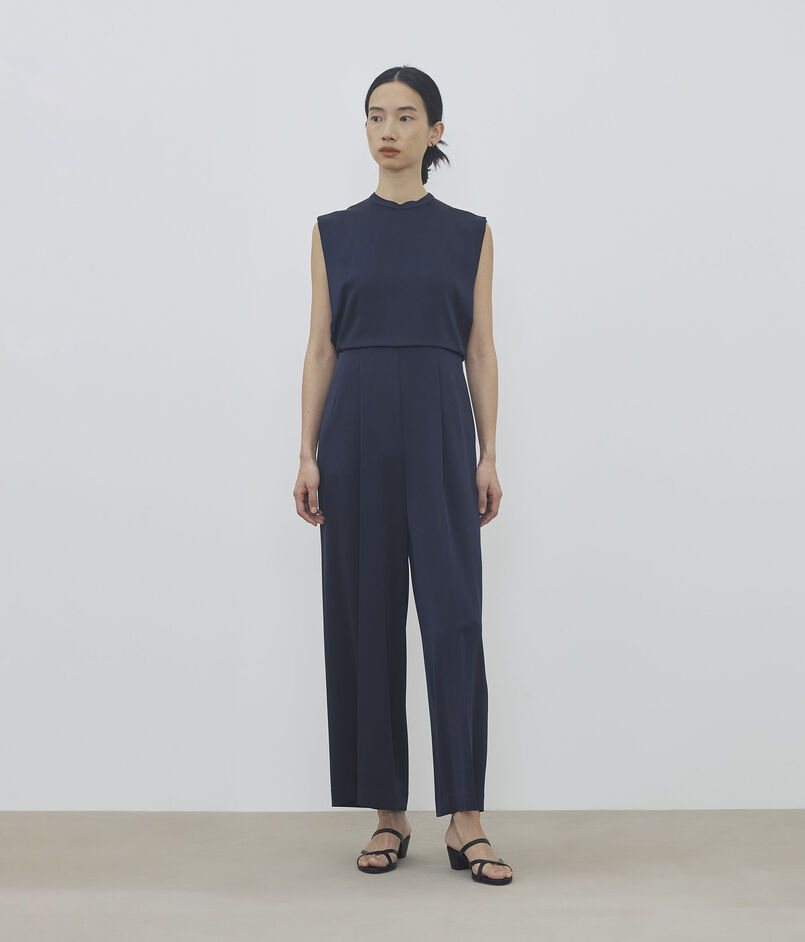 クロップド丈のノースリーブブラウスをタックパンツに合わせたようなデザインで一枚でさまになるオールインワン。
