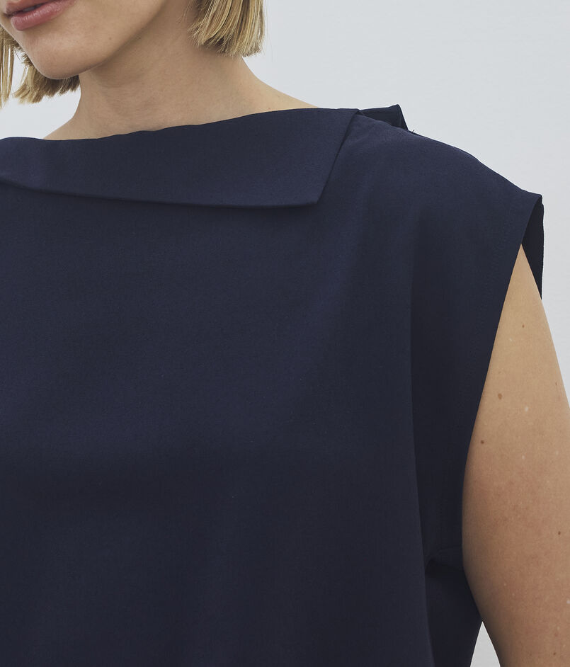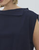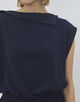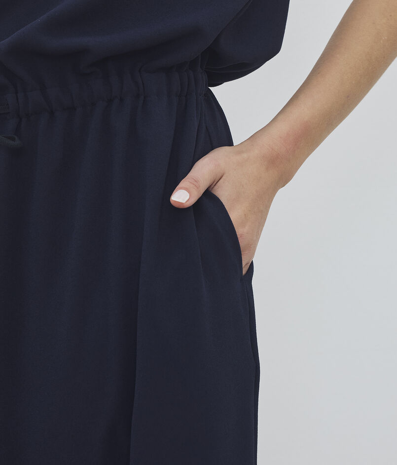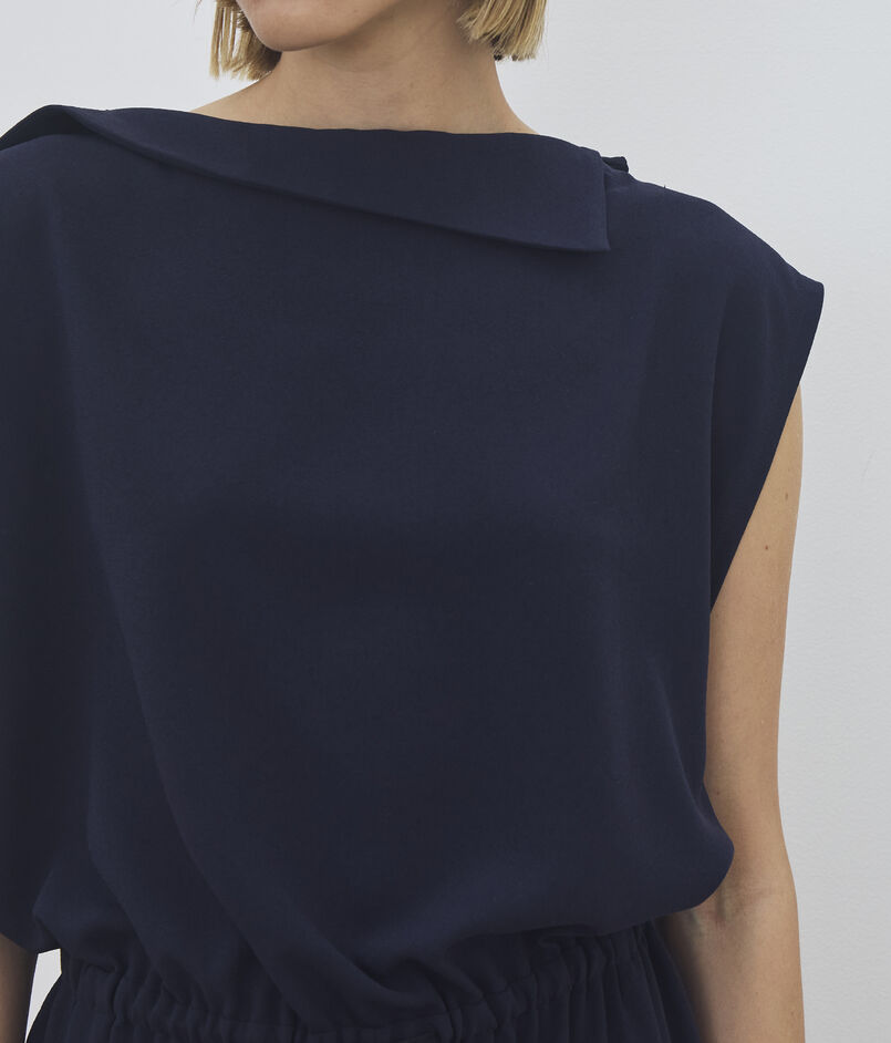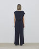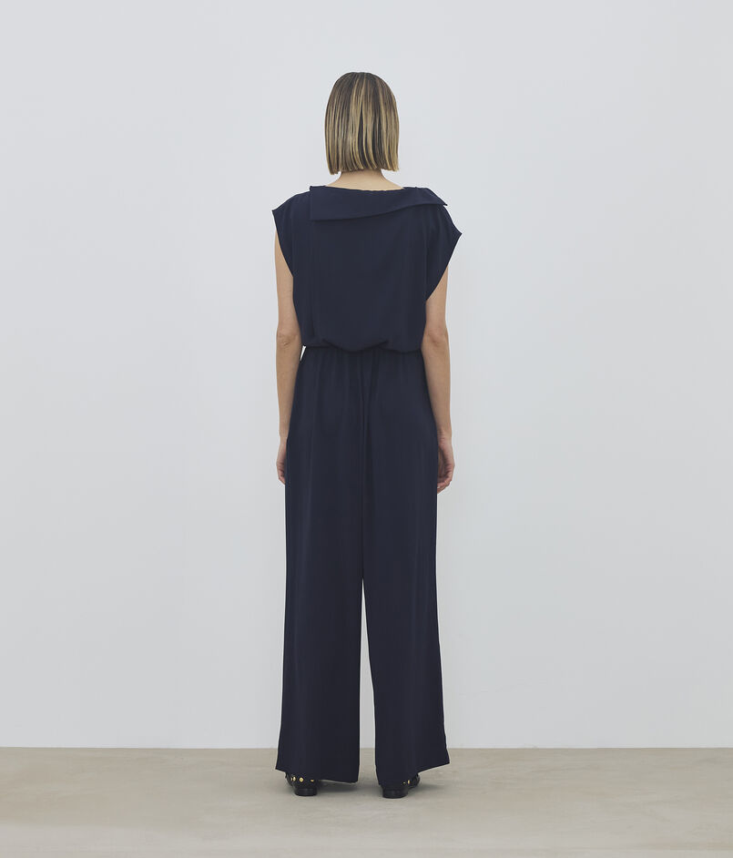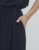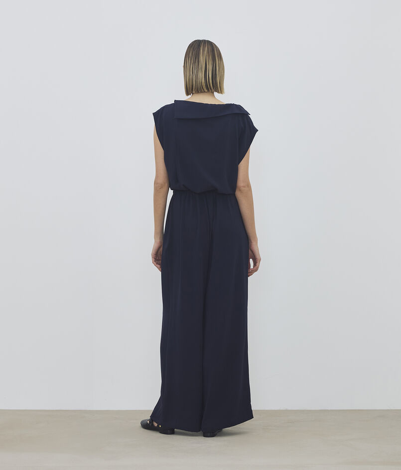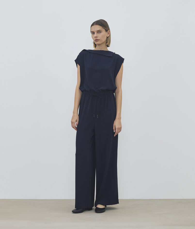 リラックス感のあるオールインワンは、襟ぐりのアシンメトリーなデザインでモードな雰囲気に仕上げた一着。