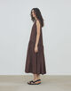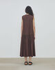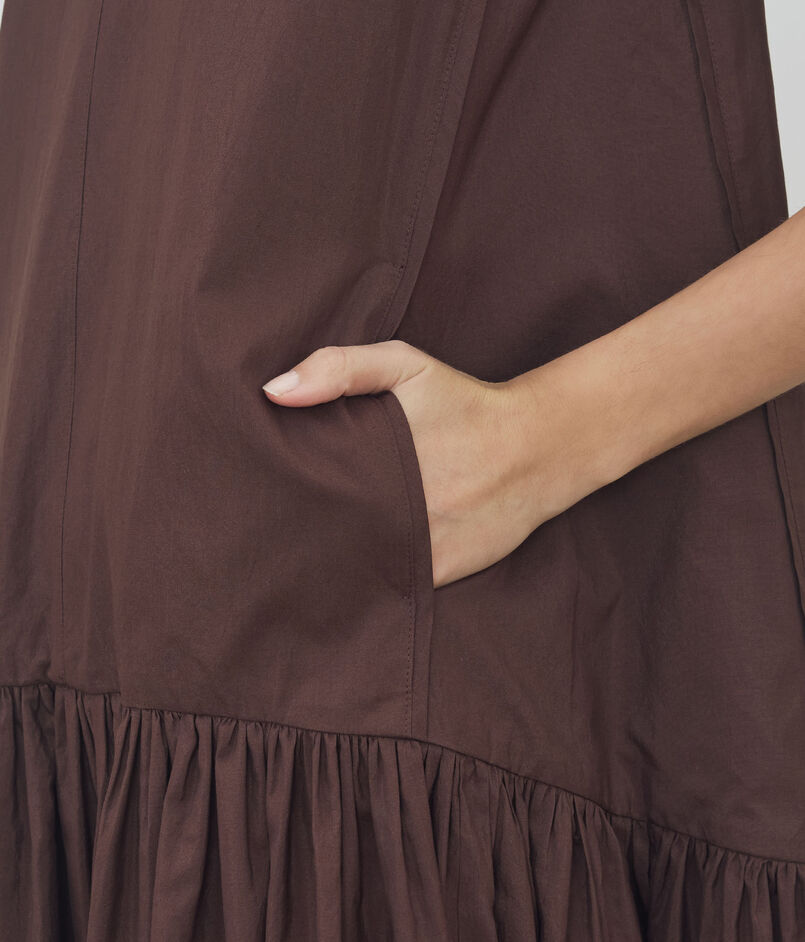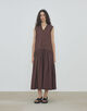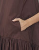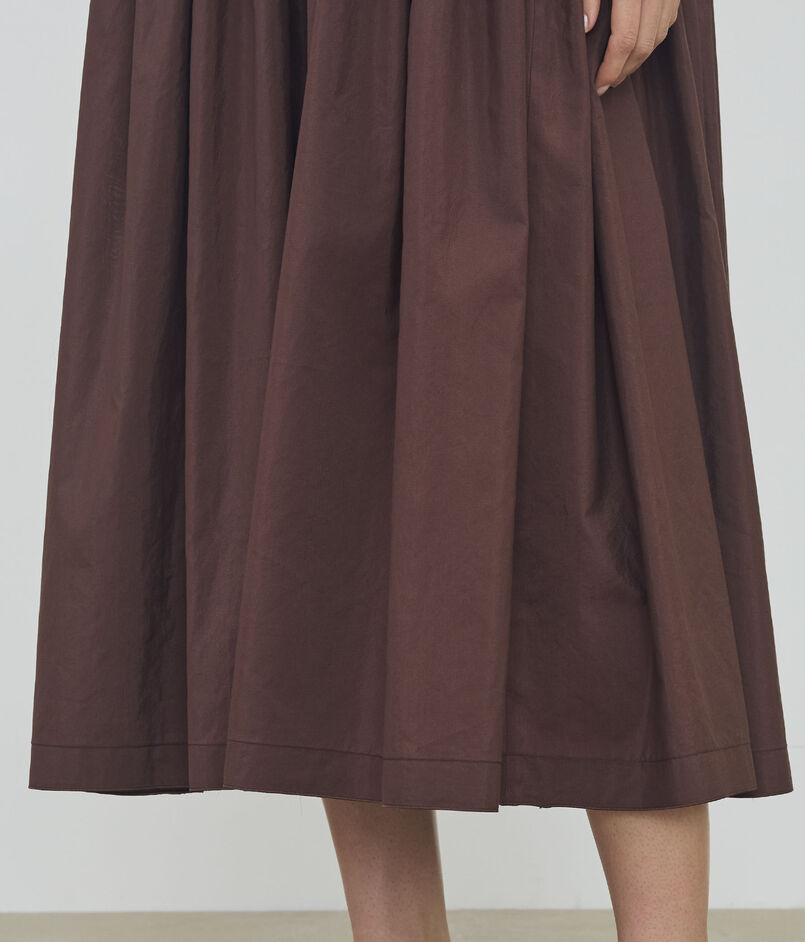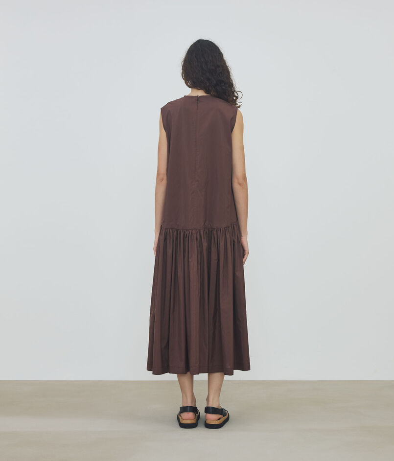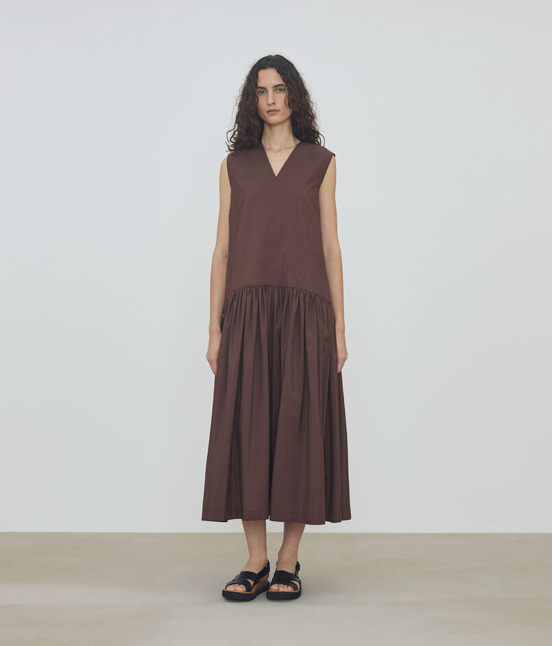 裾の切り替えにたっぷりとギャザーを寄せた、一枚でさまになるVネックドレス。