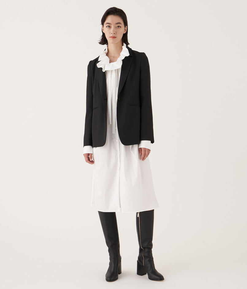 同素材のパンツ(商品番号:22-04-34-04012)とのセットアップスタイルやデニムを合わせてカジュアルダウンして着こなすなど、オフィスからデイリーシーンまで幅広く活躍してくれる万能なアイテム。