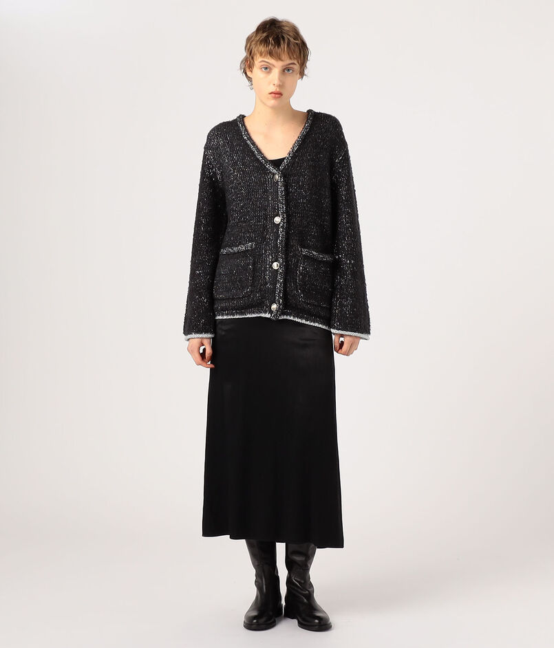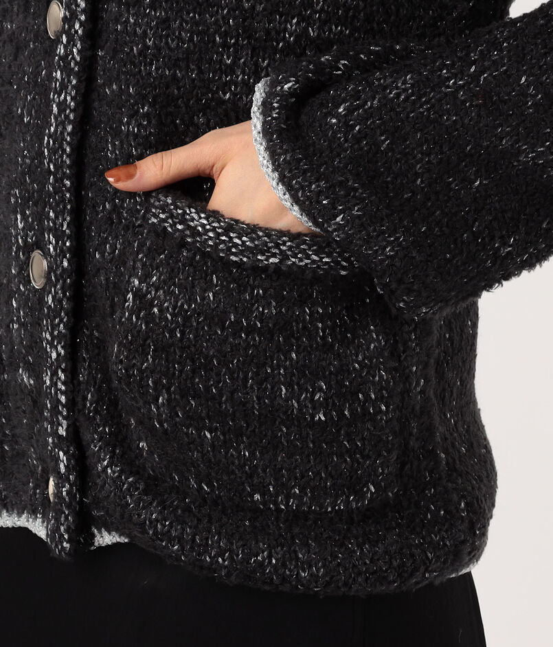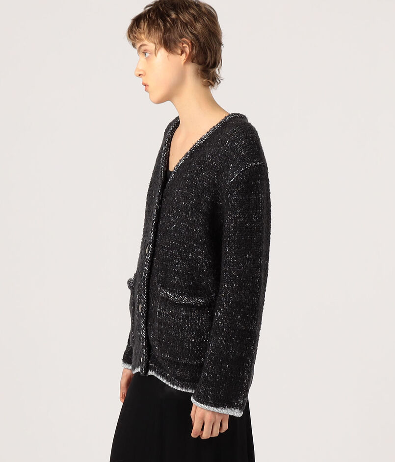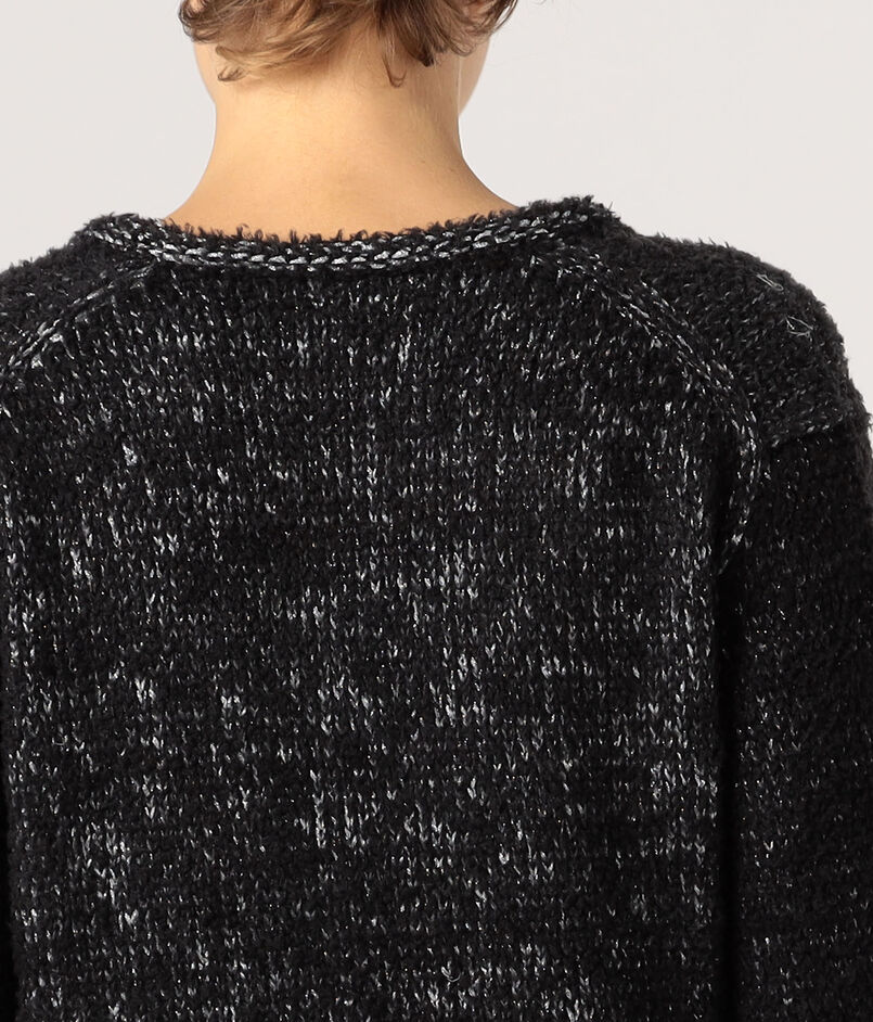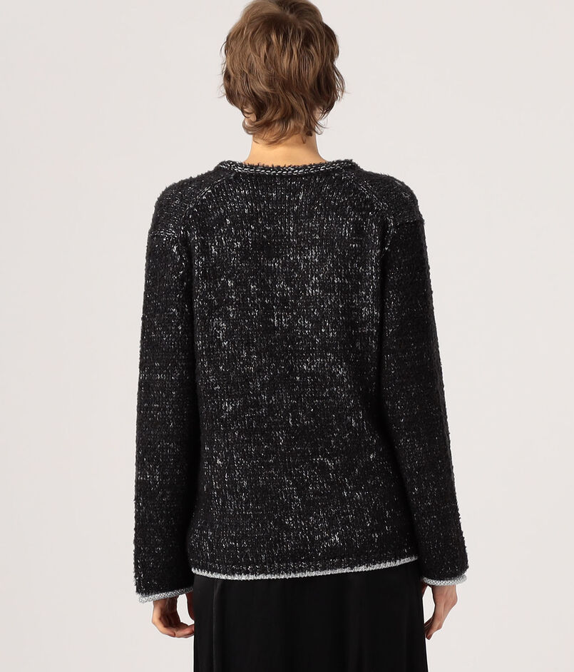 リリヤーン状のラメがウールファーの毛足の間からランダムに見える、ユニークな素材感が魅力的なニットシリーズ。