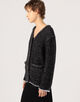 フロントに配したメタルボタンや袖口と裾の配色のパイピングディテールでアクセントをつけています。