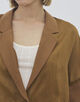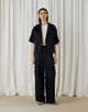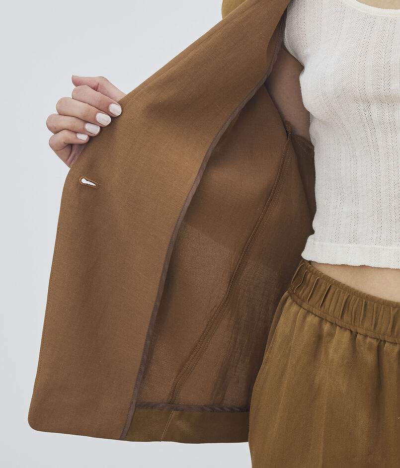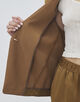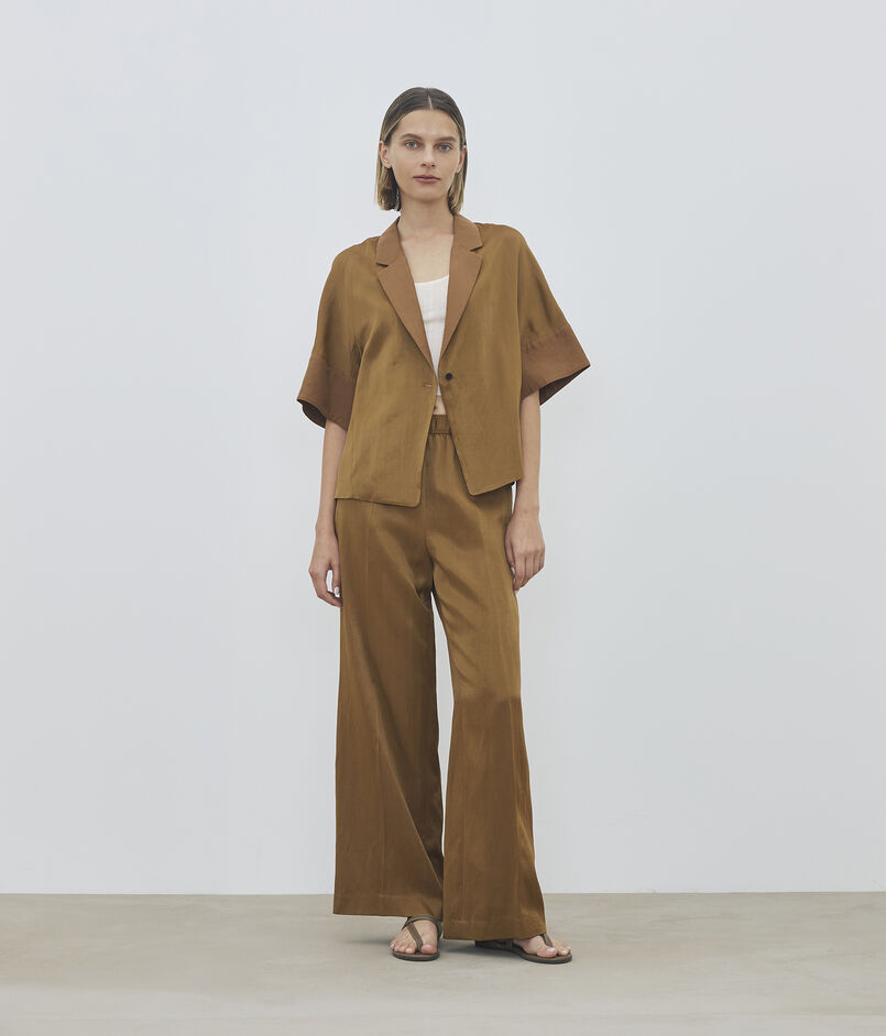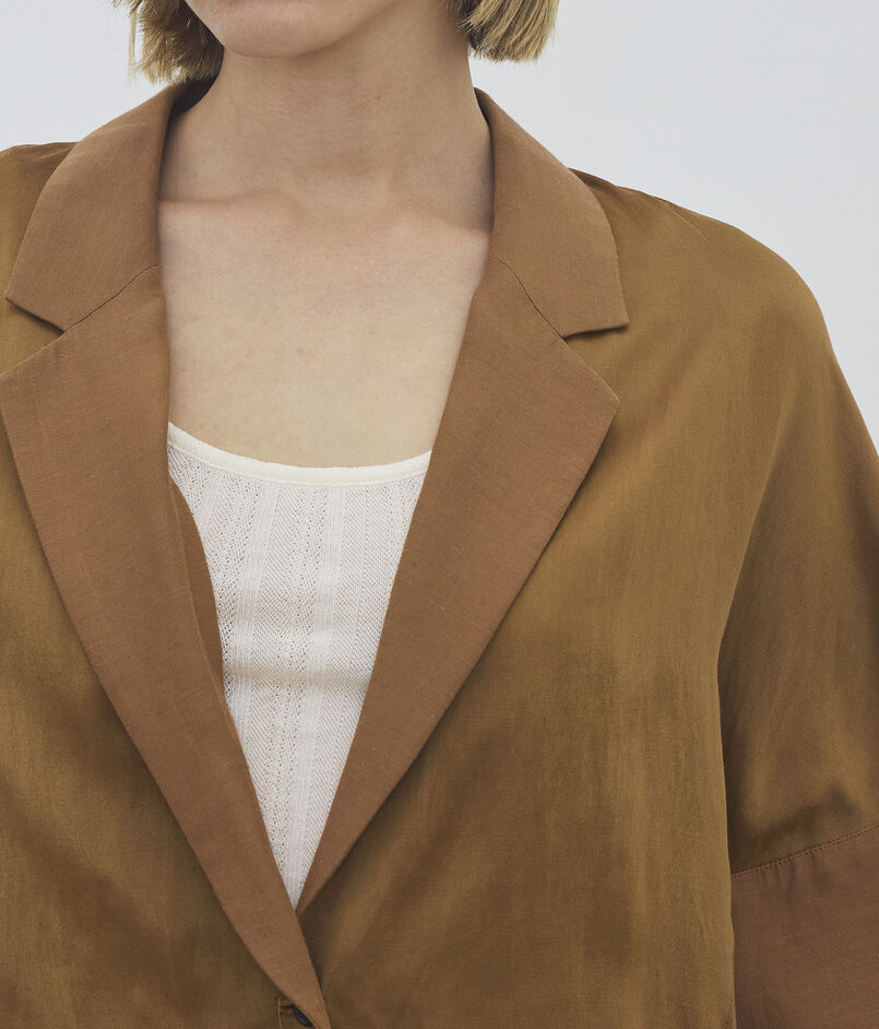 ジャケットは細幅のラペルカラーでマニッシュな印象ながら、ゆったりとしたシルエットにハーフスリーブデザインでリラックスムード漂う一着。