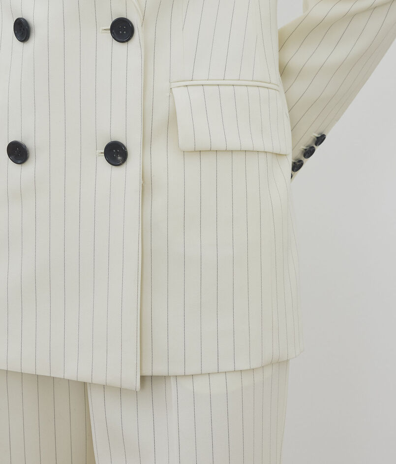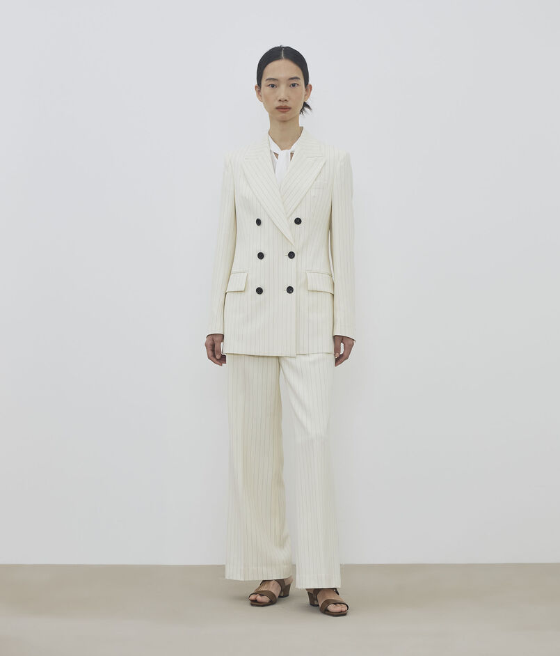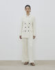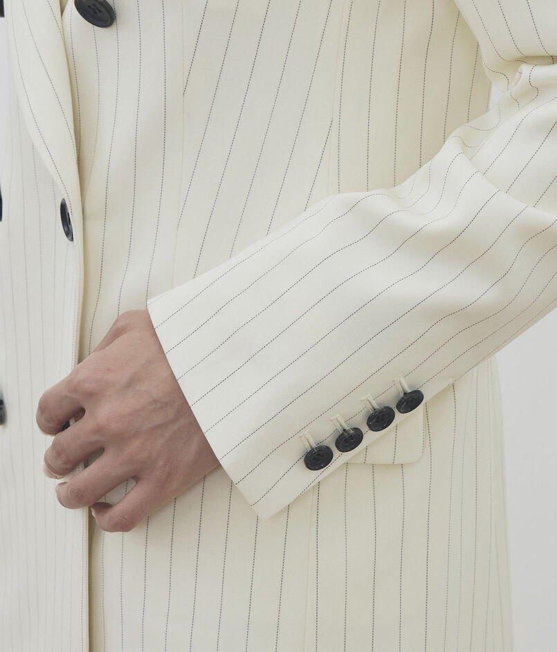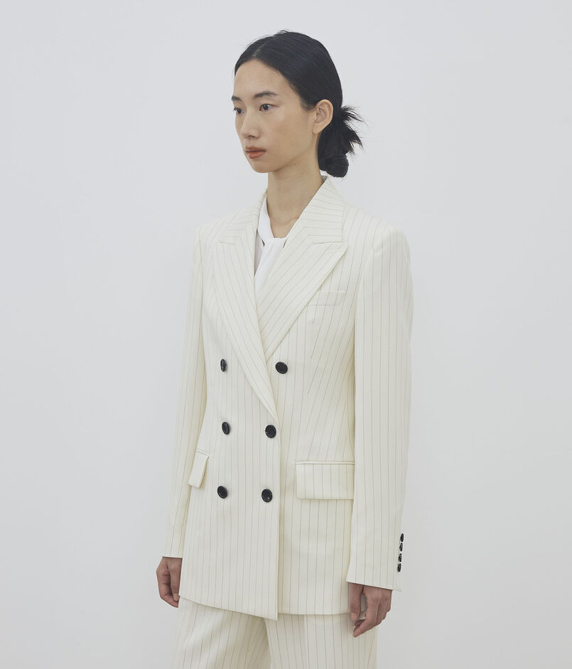 定番のダブルブレスレッドジャケットは、釦を増やしデザインをリニューアル。